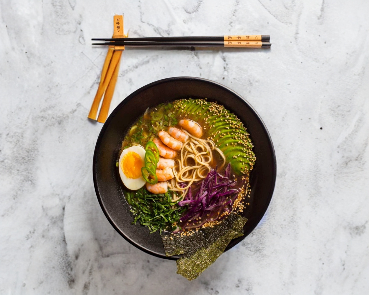 Ramen 30oz Camarón, col morada, chile serrano, aguacate