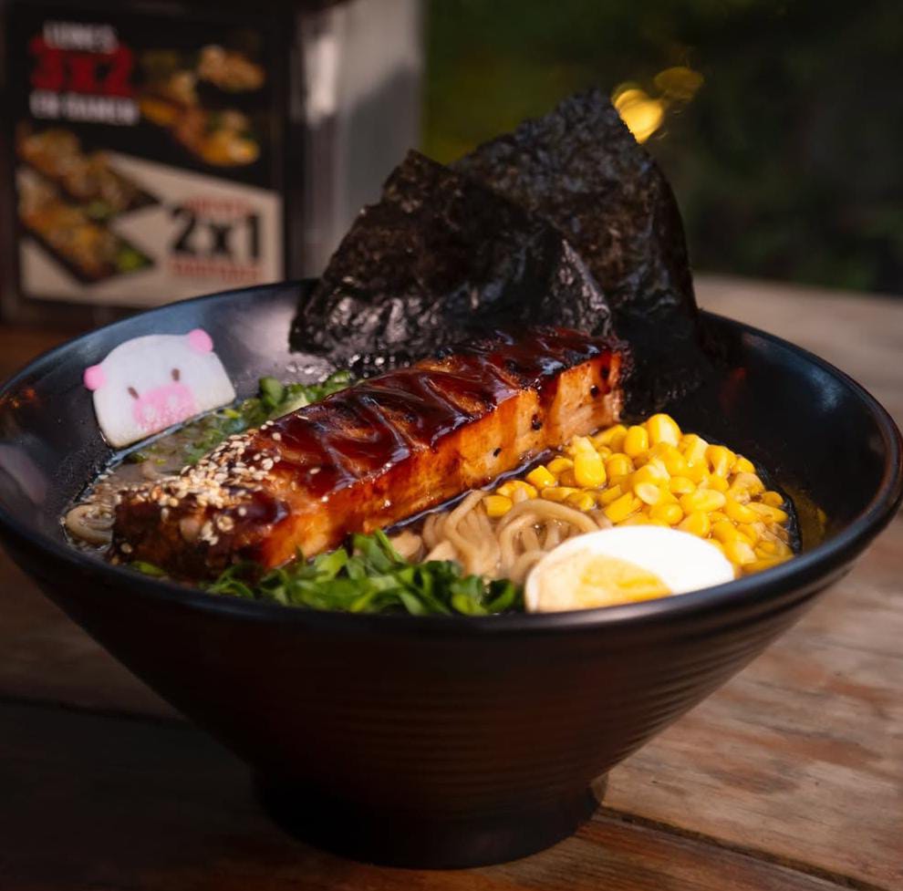 Delicioso ramen de costilla de puerco ahumada, salsa tokatsu y elote amarillo.
