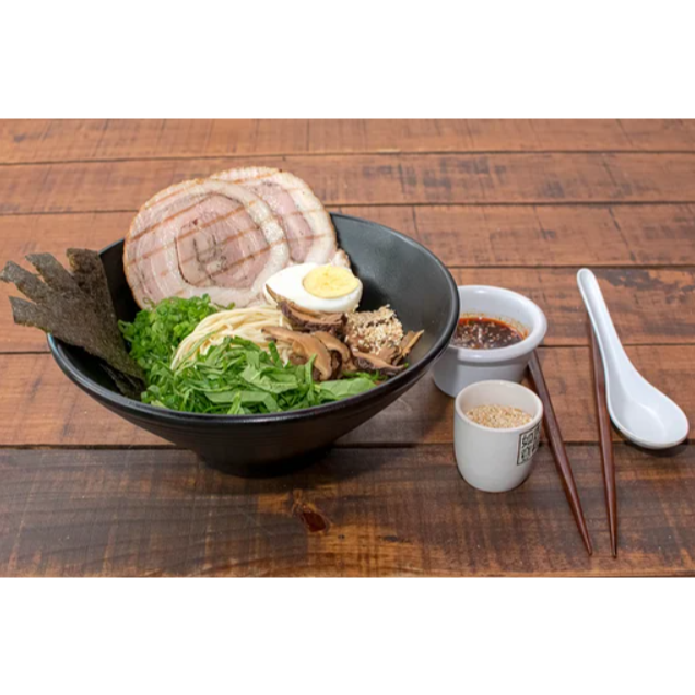Ramen 30oz Pasta udon (gruesa), Lomo de cerdo, Tocino ahumado, alga wakame.