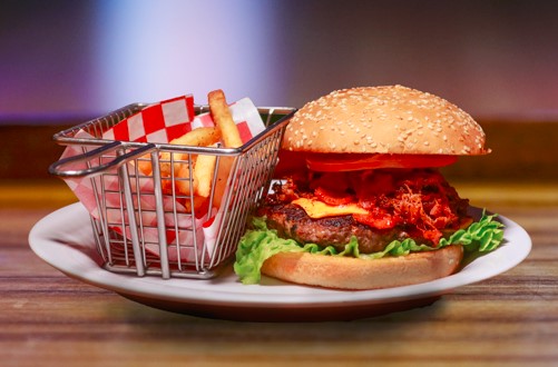 150 gr De carne sirloin, 40 gr de pecho de res BBQ, 30 gr de tocino frito, tomate, lechuga orejona y cebolla blanca.