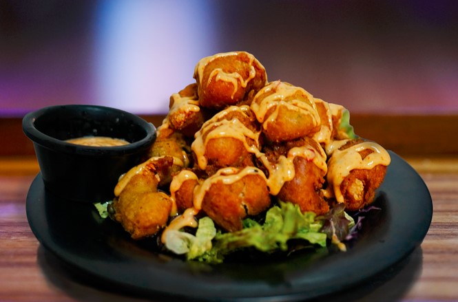 Clásicos camarones roca, 150 gr de camarón en tempura, salsa spicy y reducción de tamarindo.