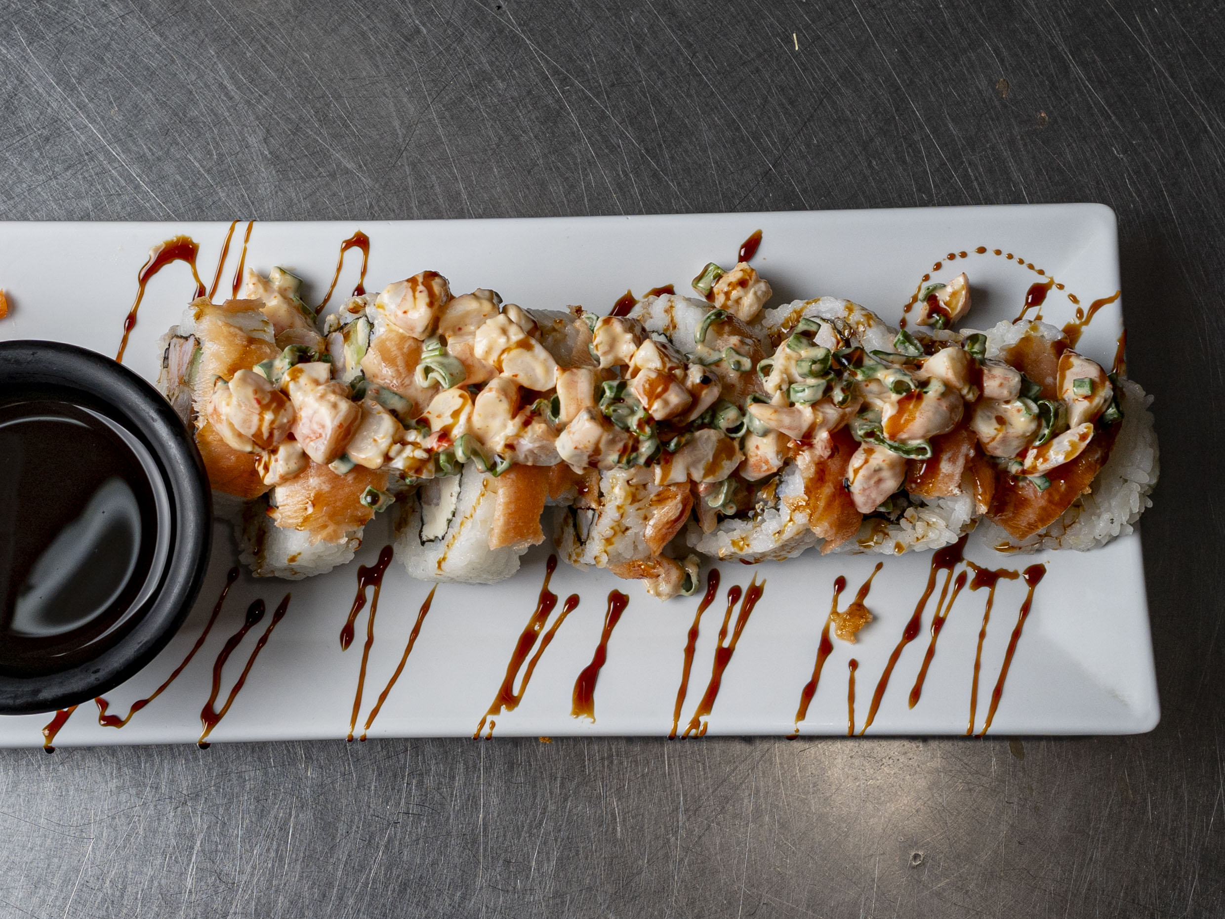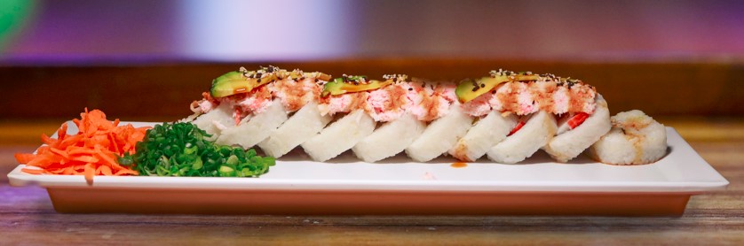 Por dentro Philadelphia, pepino, aguacate y camarón, por fuera tiras de surimi adornado con camarón empanizado y bañado con salsa de anguila.