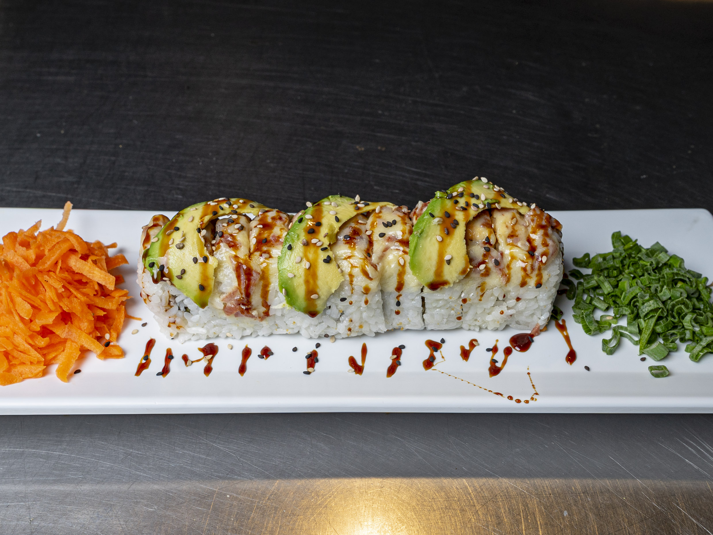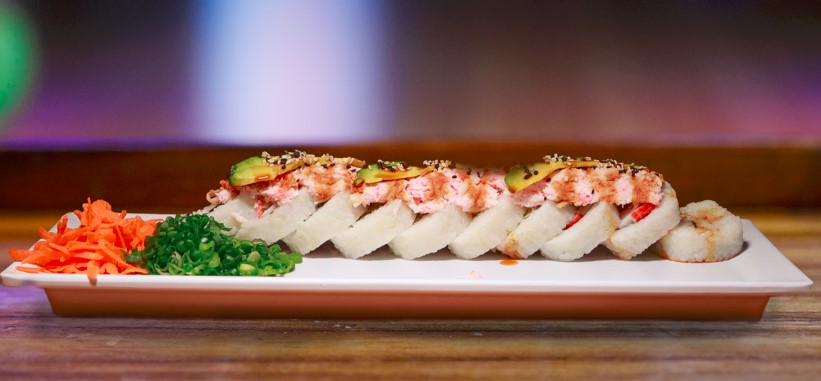 Por dentro Philadelphia, pepino, aguacate y surimi, por fuera topping de tampico con camarón y pulpo adornado con aguacate, ajonjolí bañado en salsa de anguila.