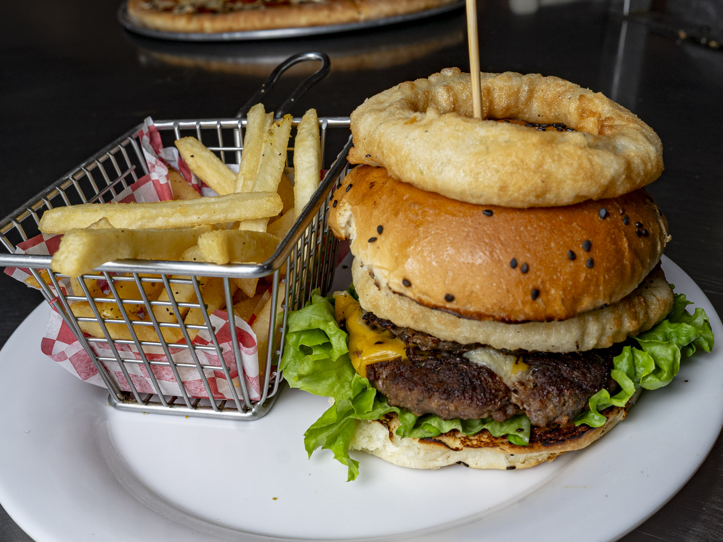 150 gr De carne sirloin, aros de cebolla tempura, 35 gr de guacamole tradicional y 30 gr de queso chihuahua.