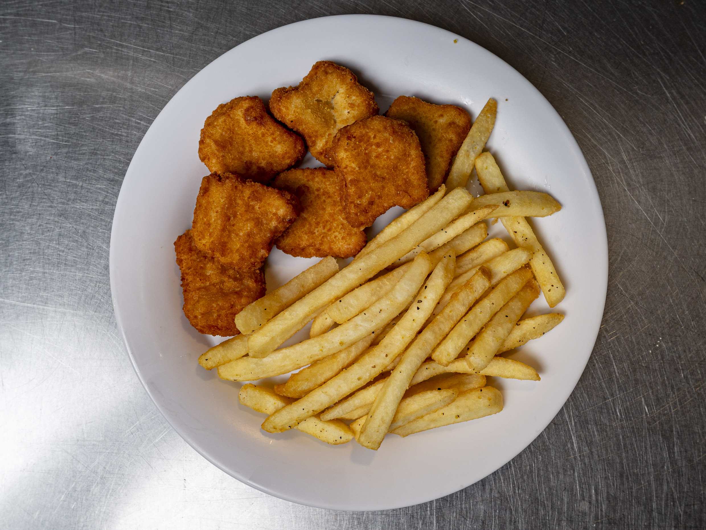 6 Piezas de nuggets de pollo acompañado con papas a la francesa.