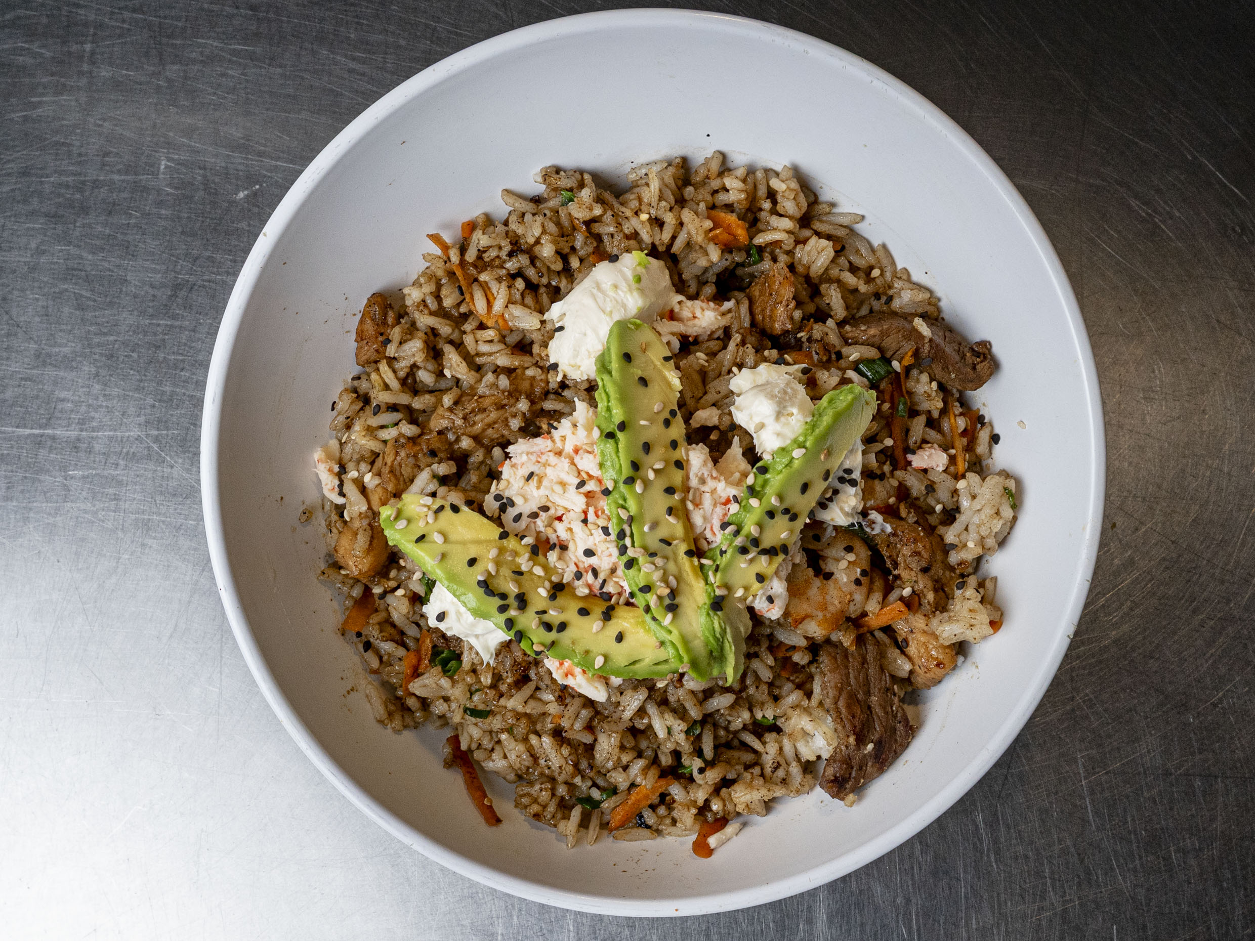 Arroz frito con zanahoria, cebollín, res, camarón y camarón, pollo en una cama de tampico adornado con Philadelphia, aguacate y ajonjolí.
