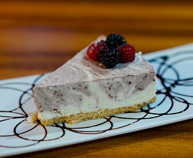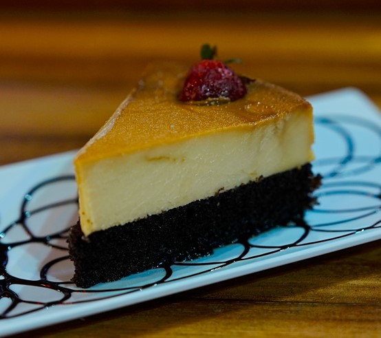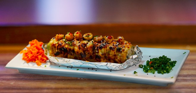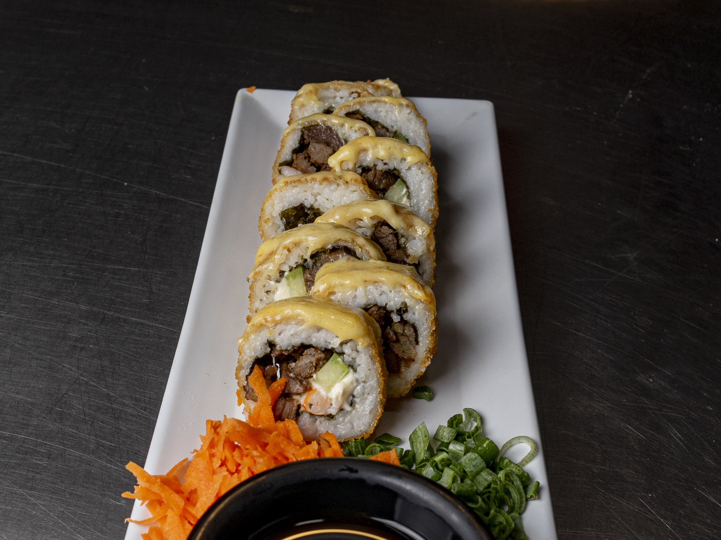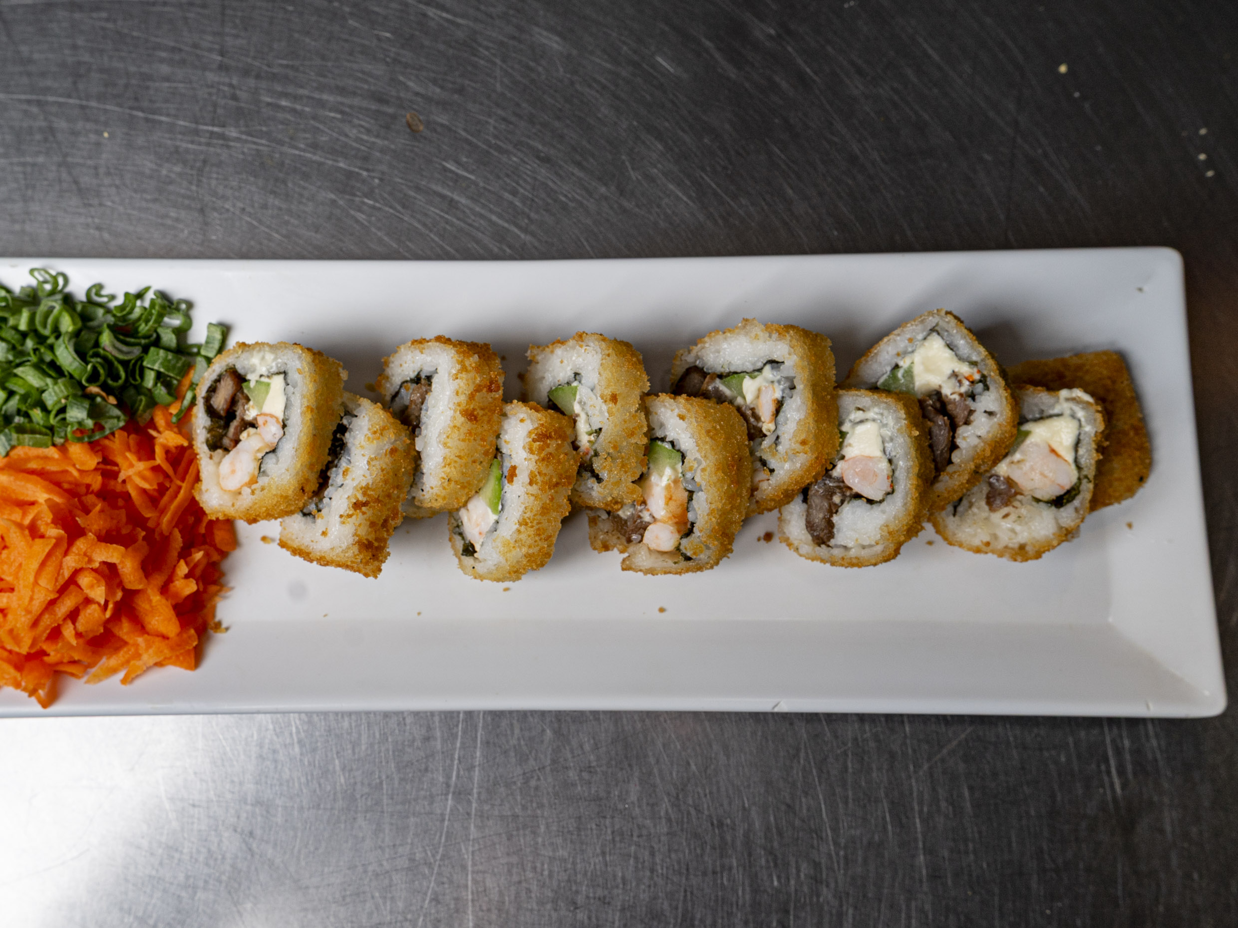 Por dentro Philadelphia, pepino, aguacate, camarón y res, por fuera gratinado.