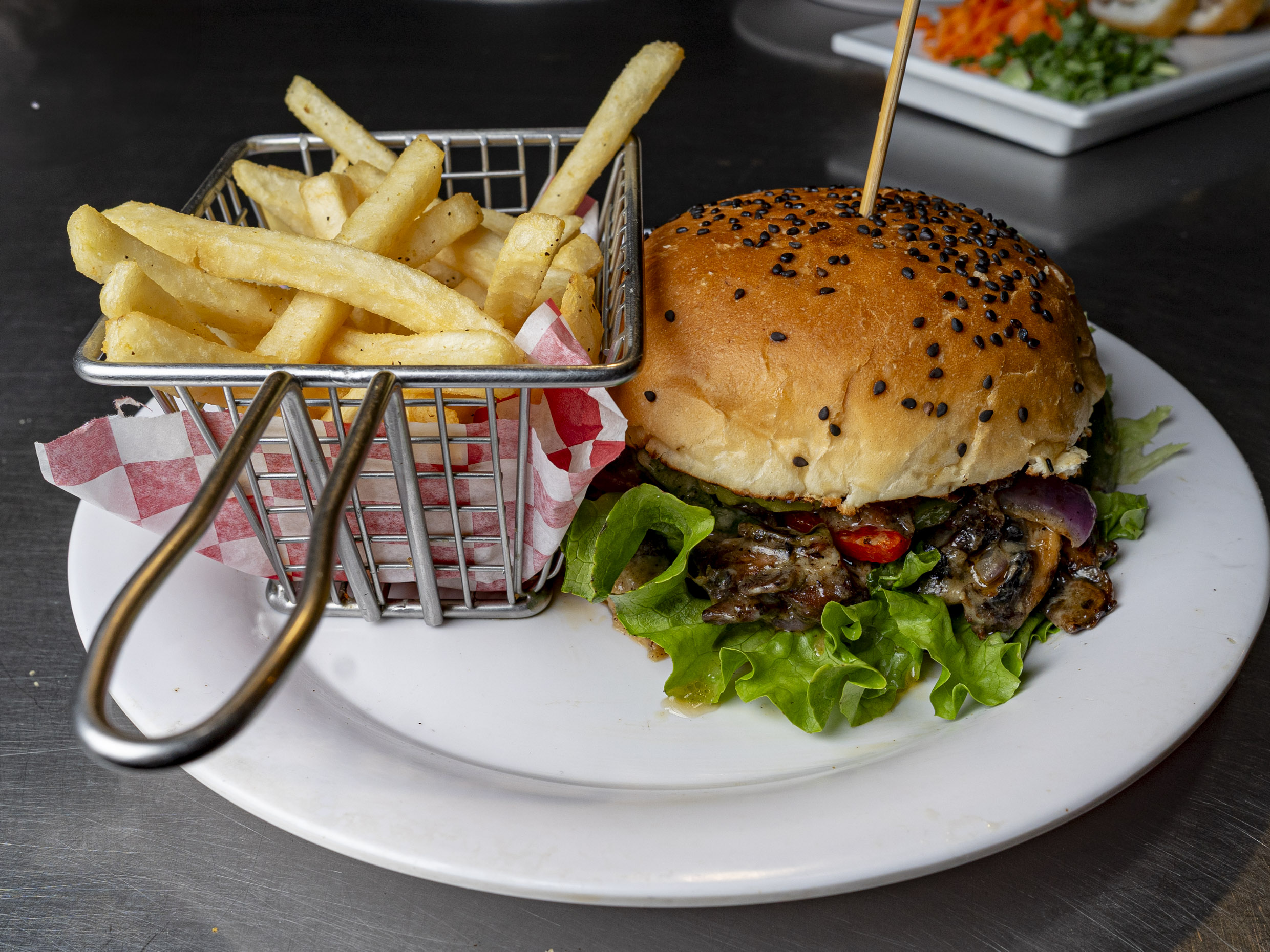 110 gr De arrachera, 50 gr de champiñón, 30 gr de tocino, chile serrano, cebolla blanca, 40 gr de queso chihuahua, lechuga, tomate bola en pan artesanal.