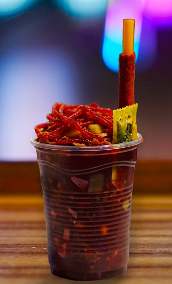 60 gr De tostitos verdes o flamin´ hot, pepino, salchicha, cacahuate, rielito, churros, skwinkles y clamato preparado (litro).