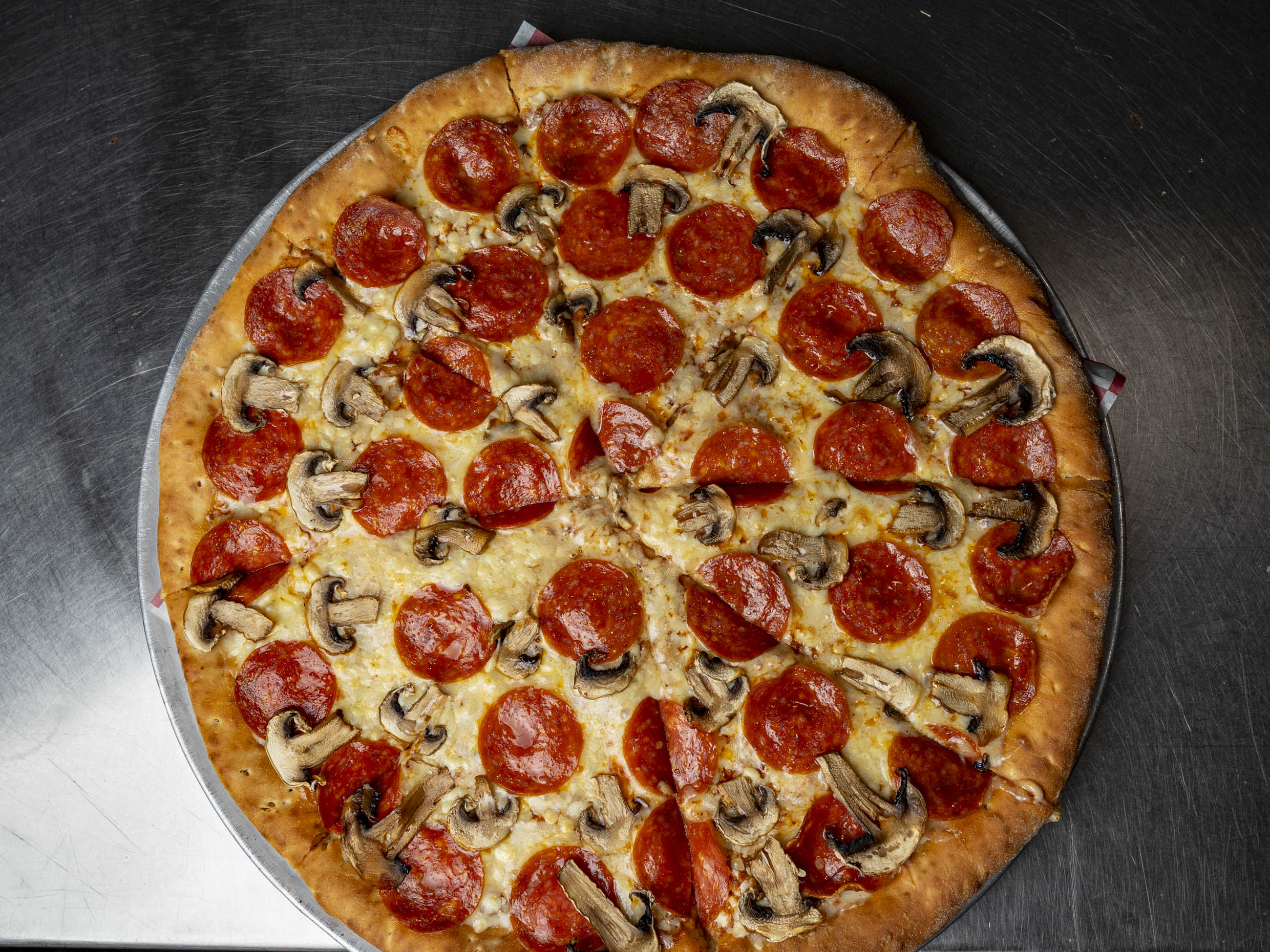Pepperoni, jamón, extra queso, tocino, aceituna, piña, champiñón, tomate, calabaza, salchicha. Tamaño familiar.