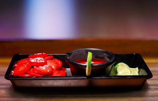 Cacahuate estilo japonés, con pepino, salchicha, rielito, skwinkles y clamato preparado.
