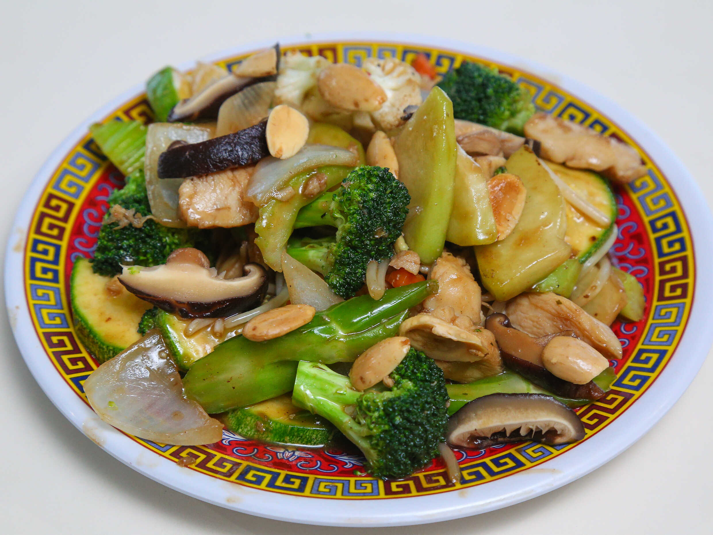 Con todos los vegetales y almendras doraditas, acompañada de arroz blanco.