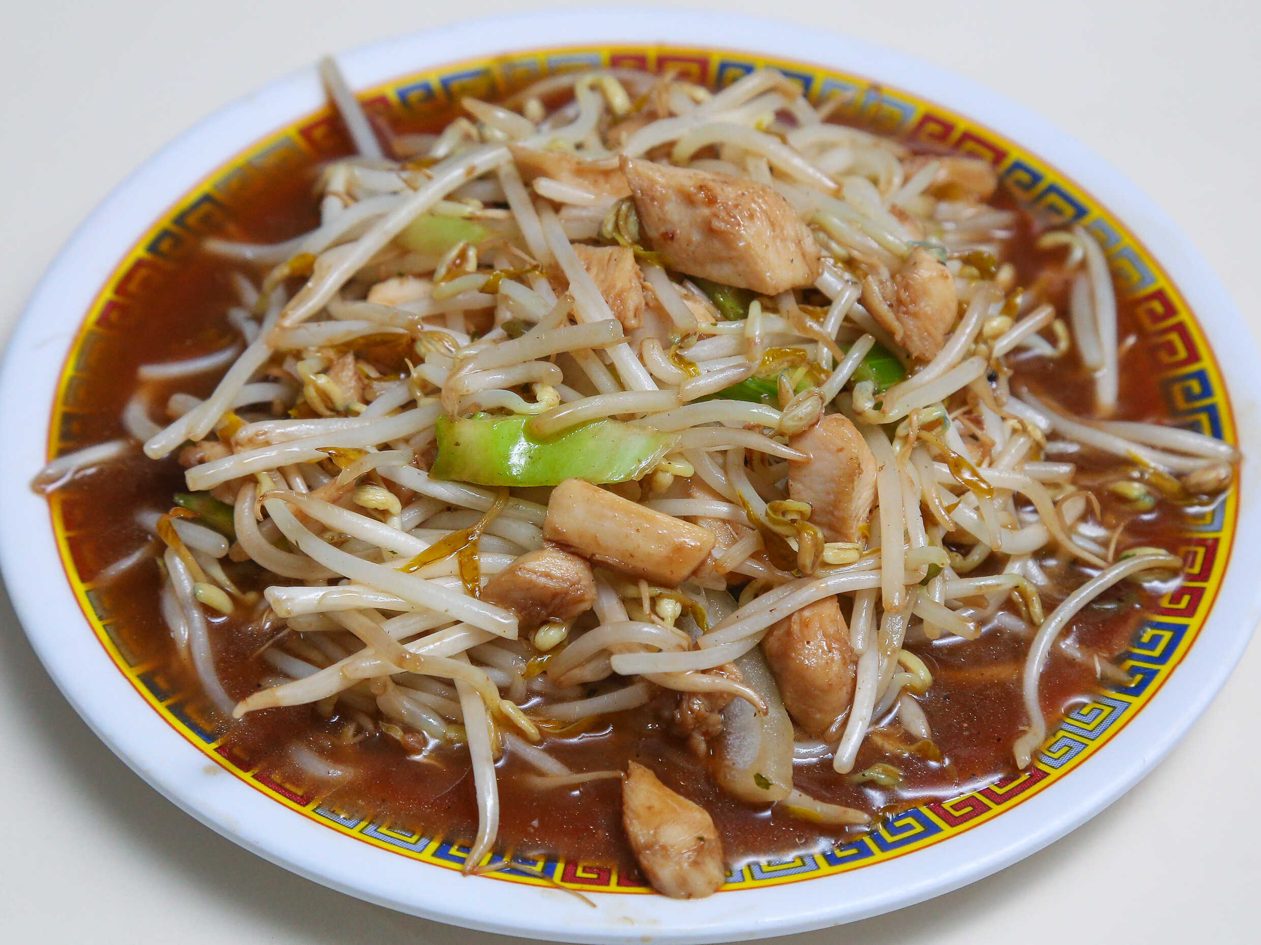 Combinación de pollo, camarón, res y germinado de soya y vegetales con salsa soya, acompañada de arroz blanco.