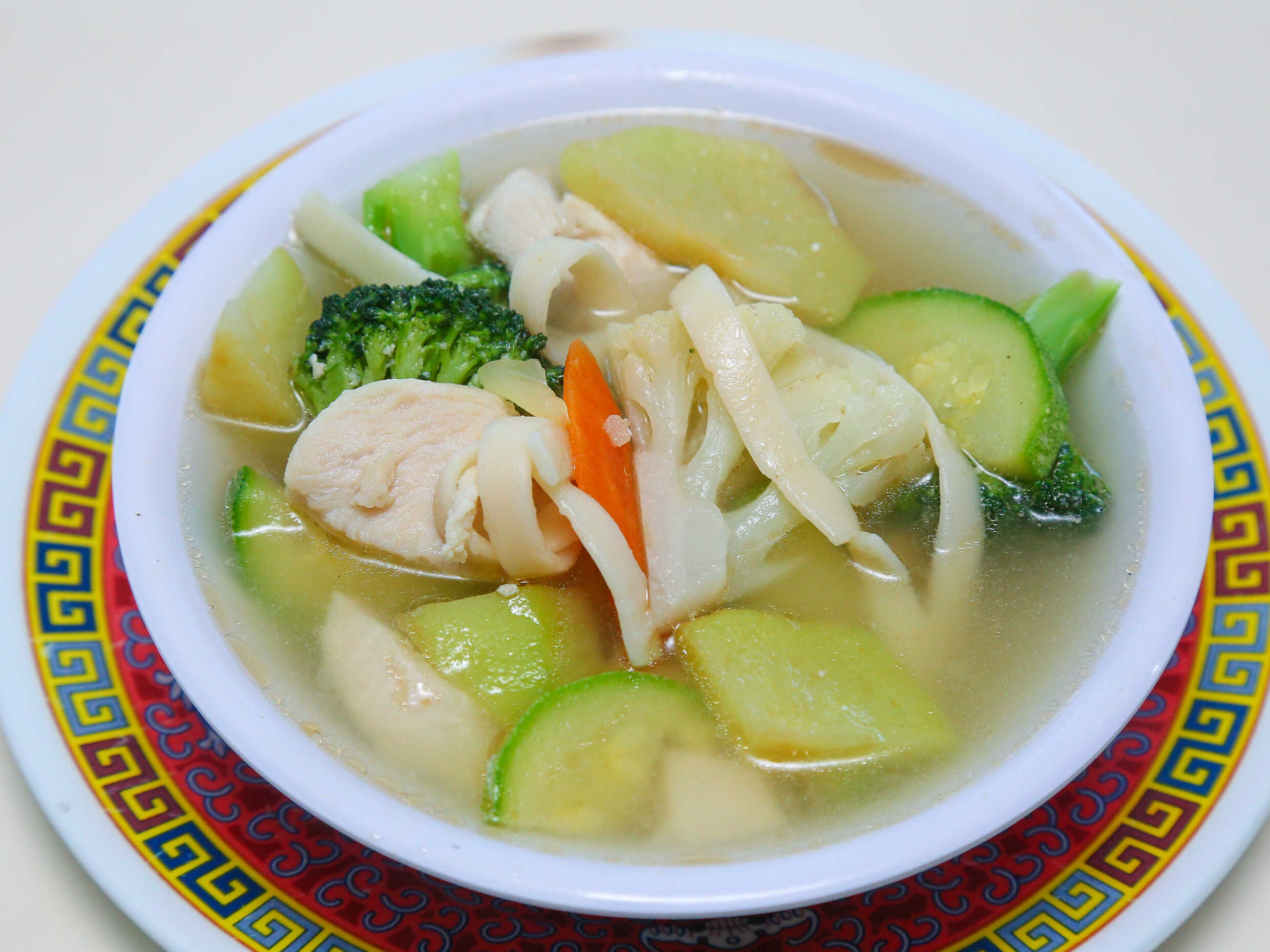 Con brócoli, apio, cebolla en salsa soya, acompañada de arroz blanco.
