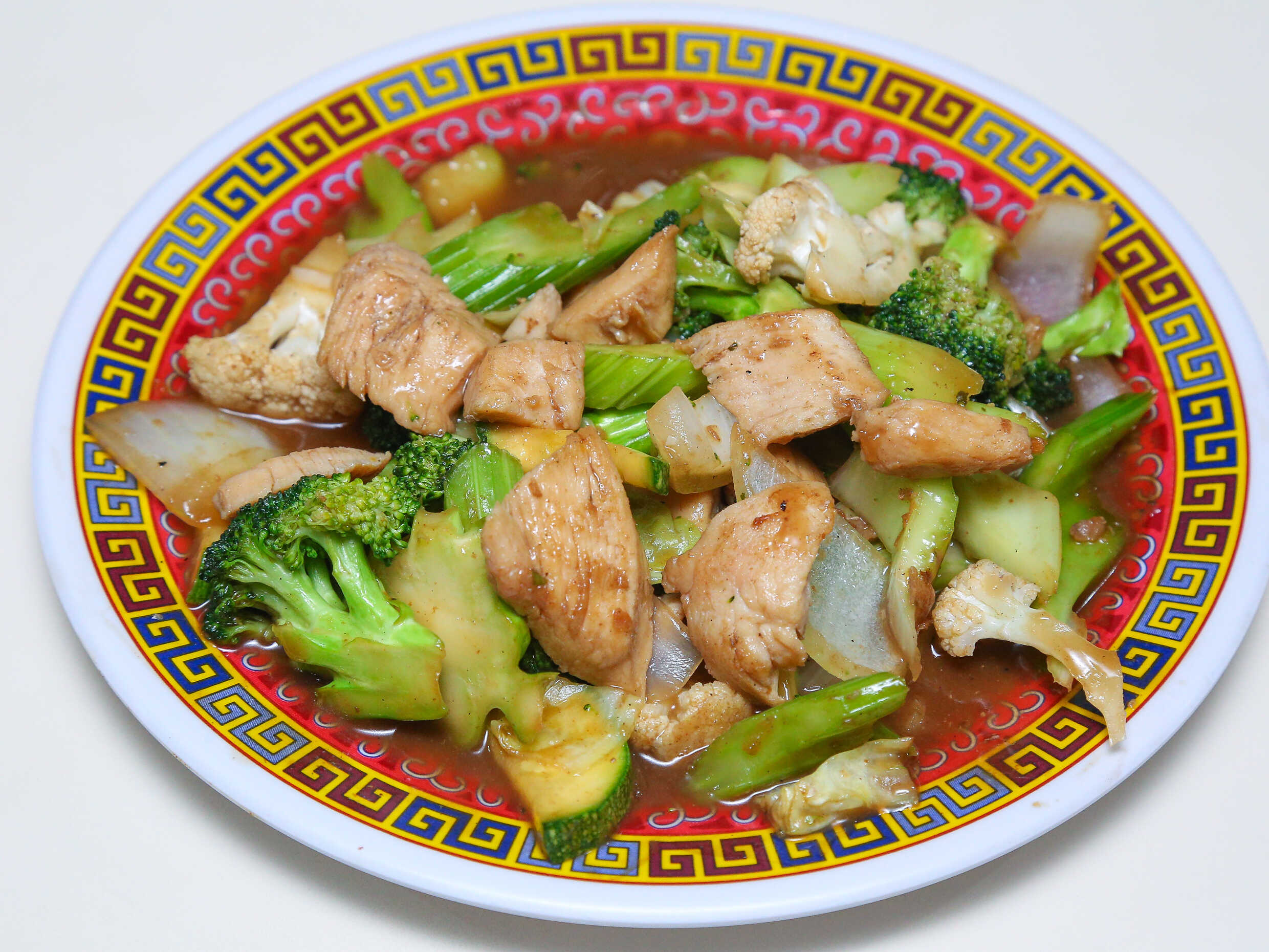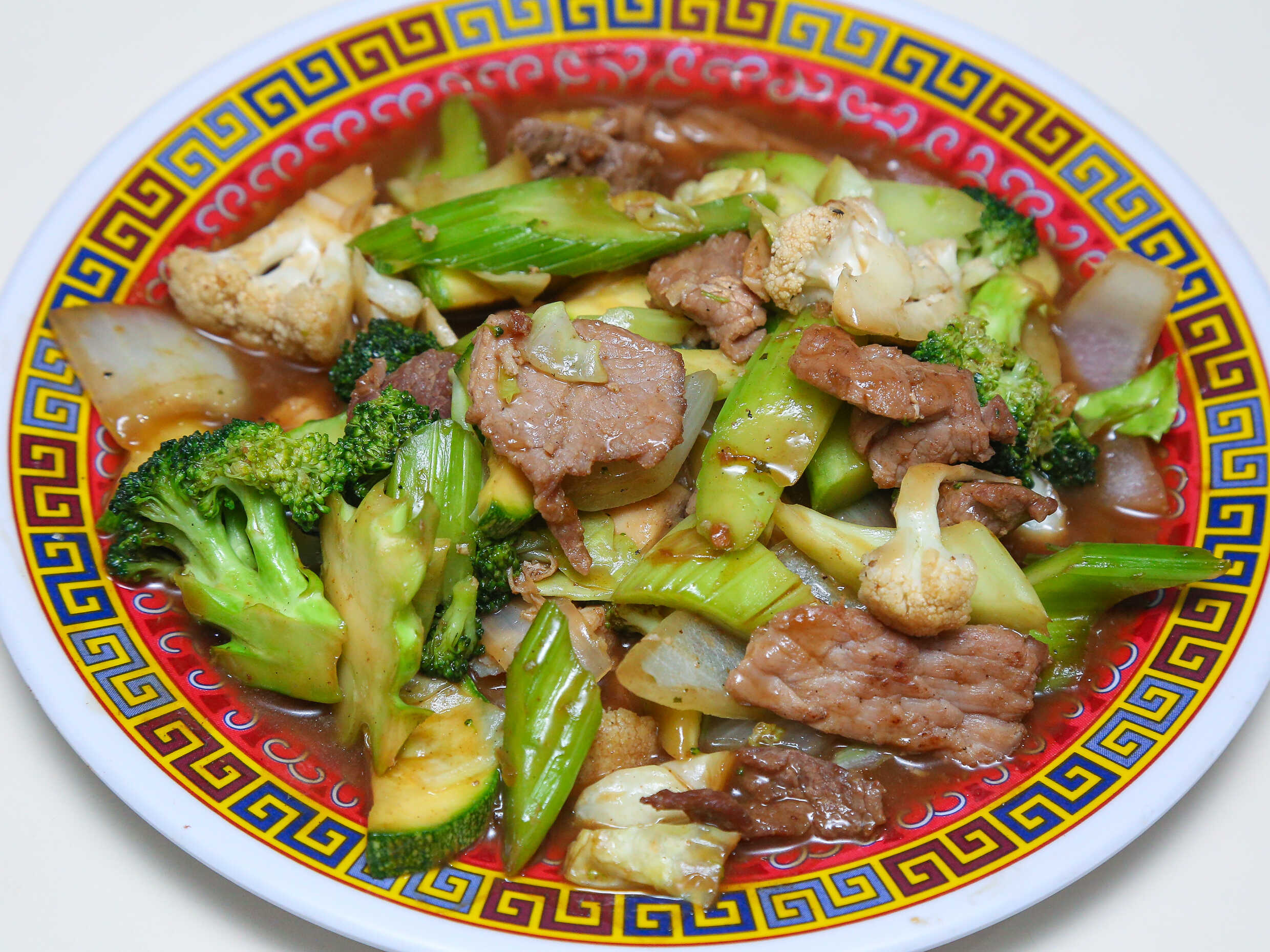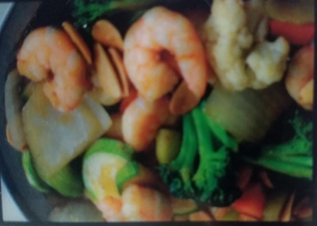 Con todos los vegetales en salsa de ostión, acompañada de arroz blanco.