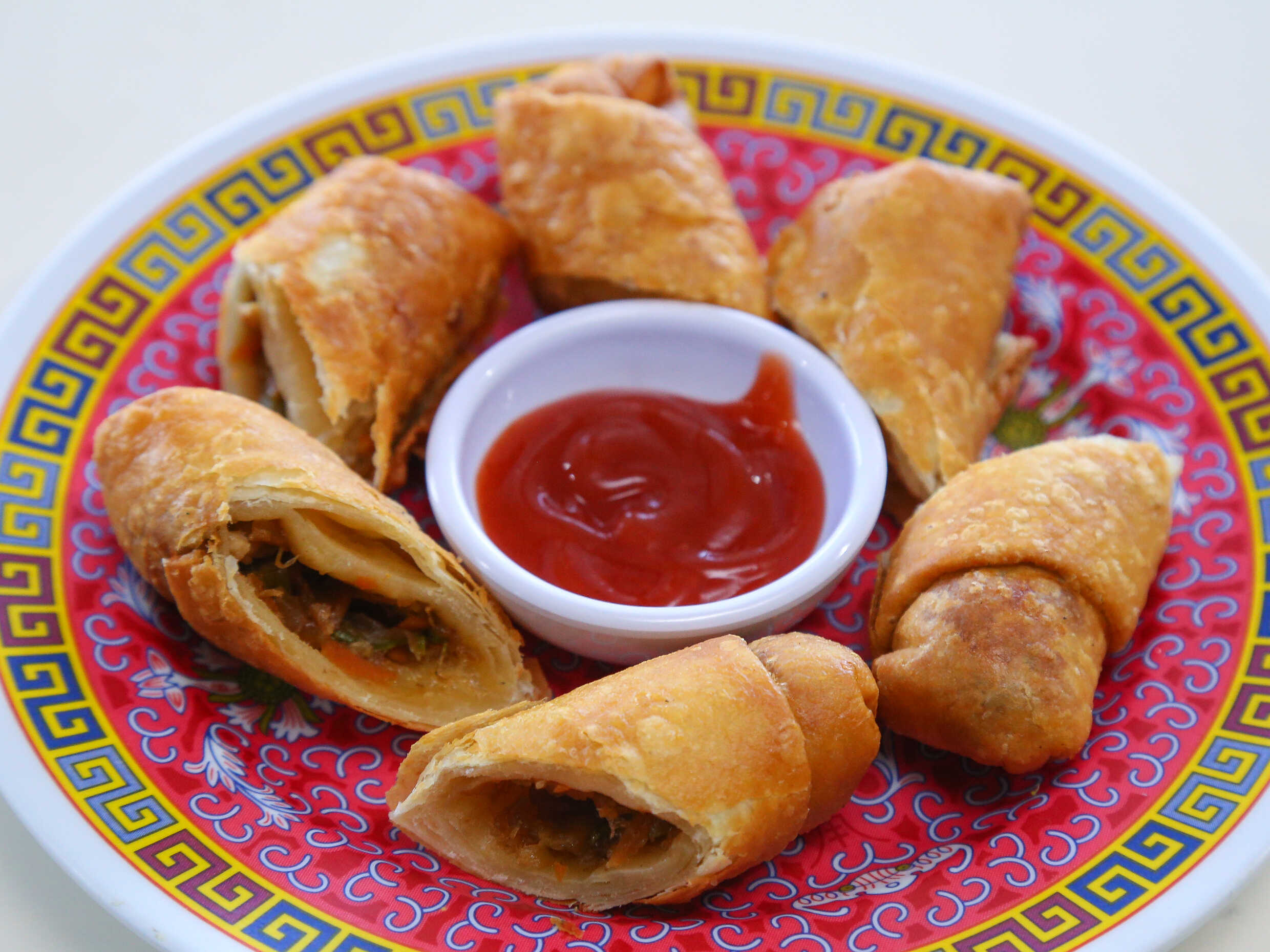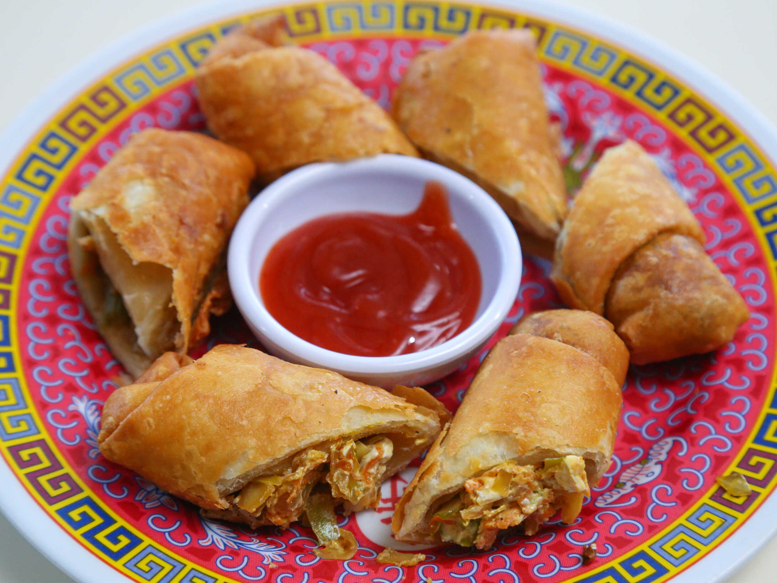 De tortilla de harina con verduras y pollo, servidos con salsa agridulce.