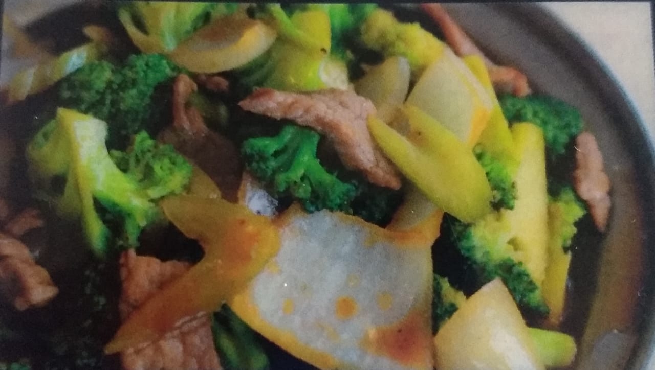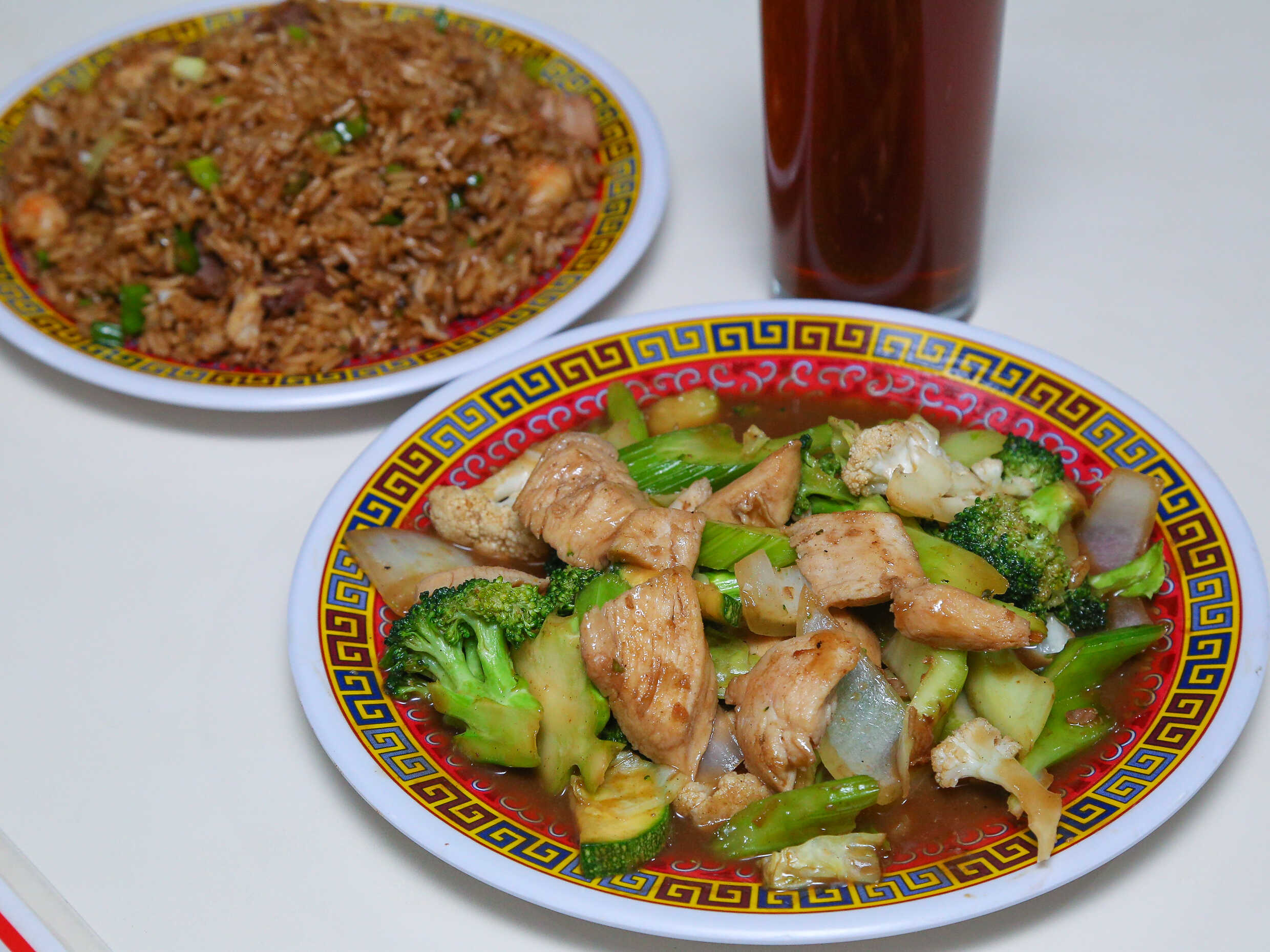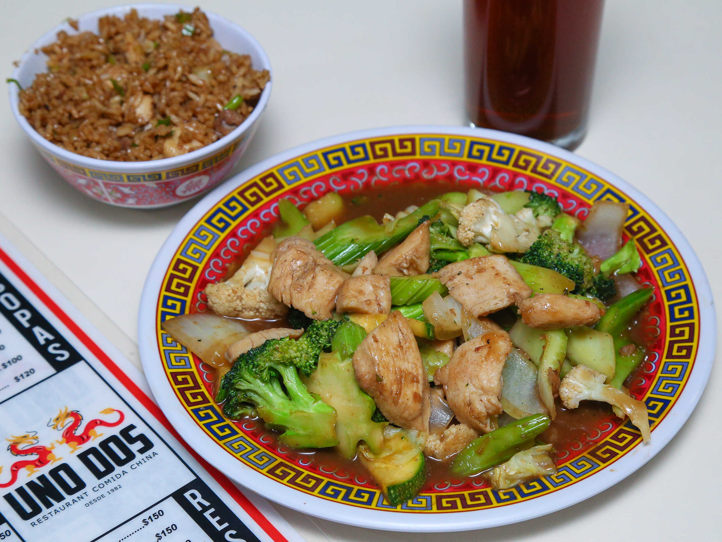 1 Arroz frito especial, 1 chow mein especial, 1 pollo kai-kiw, 1 res con brócoli y 2 litros de té.