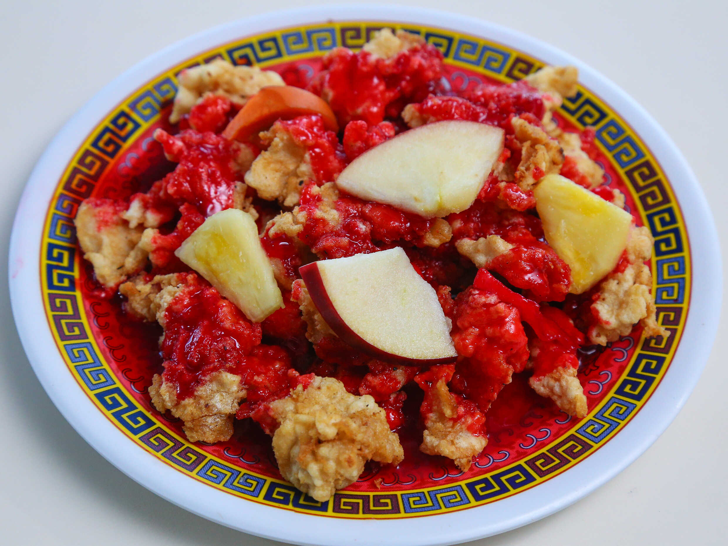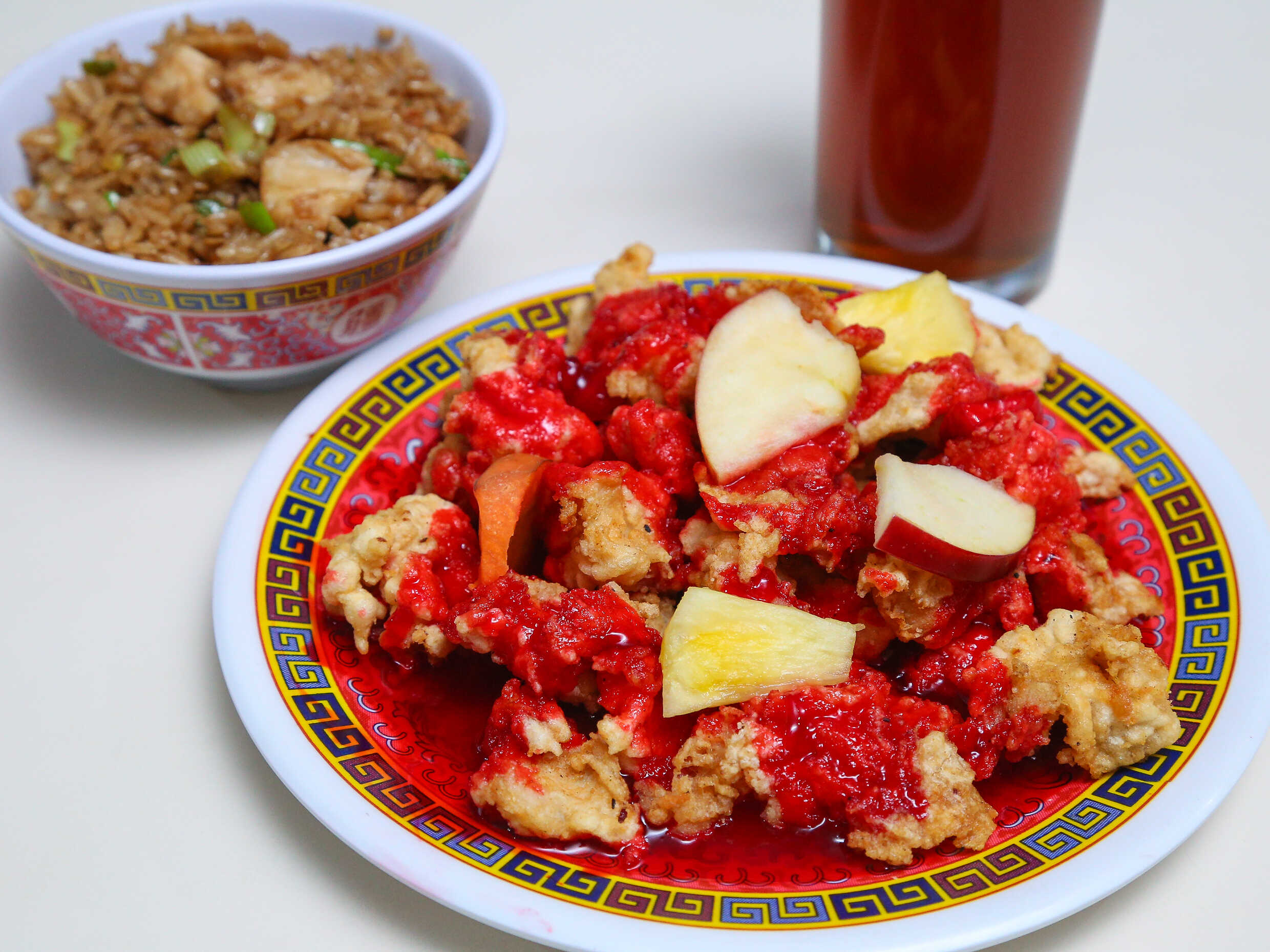Pollo agridulce, tazón de arroz frito y 1/2 litro de té.