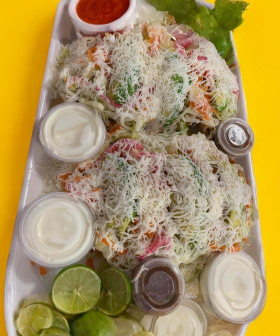 Tortilla de maiz frita, con pollo queso, crema, y salsa verde