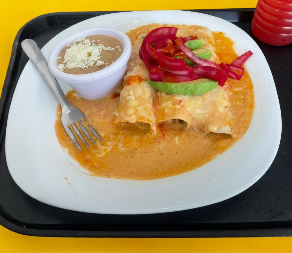 Por pieza,Tortillas rellenas con pollo bañadas en salsa suiza con complemento de frijol