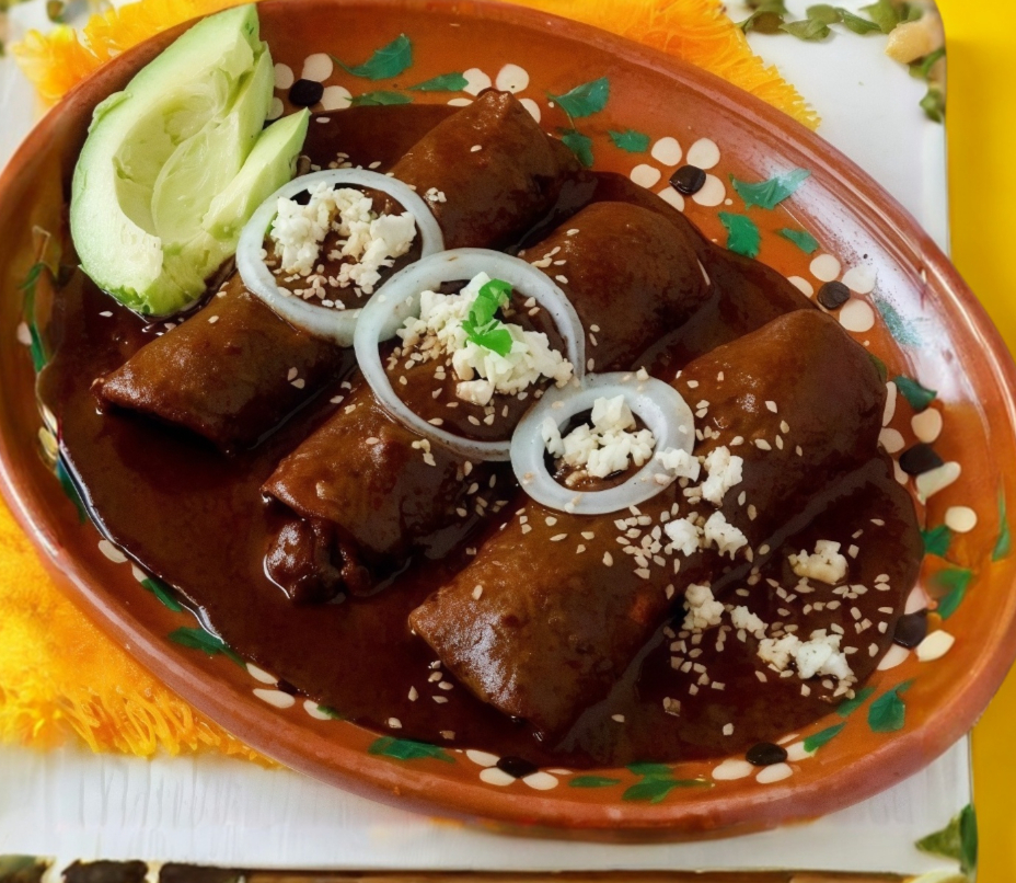 Por pieza, Tortilla rellena de pollo, cubierta de salsa mole, complemento de frijol