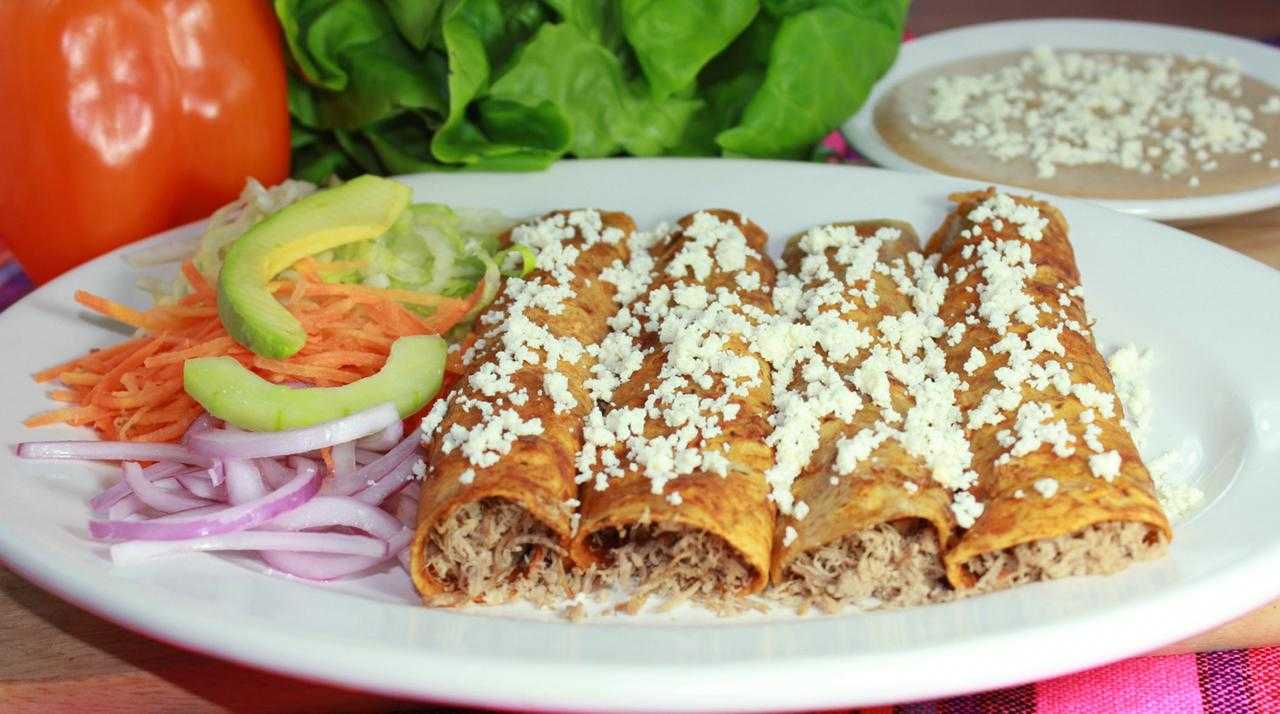 4 enchiladas de Res o Pollo, bañadas en chile rojo y queso cotija con ensalada de verduras fresca y frijoles refritos con quesito.
