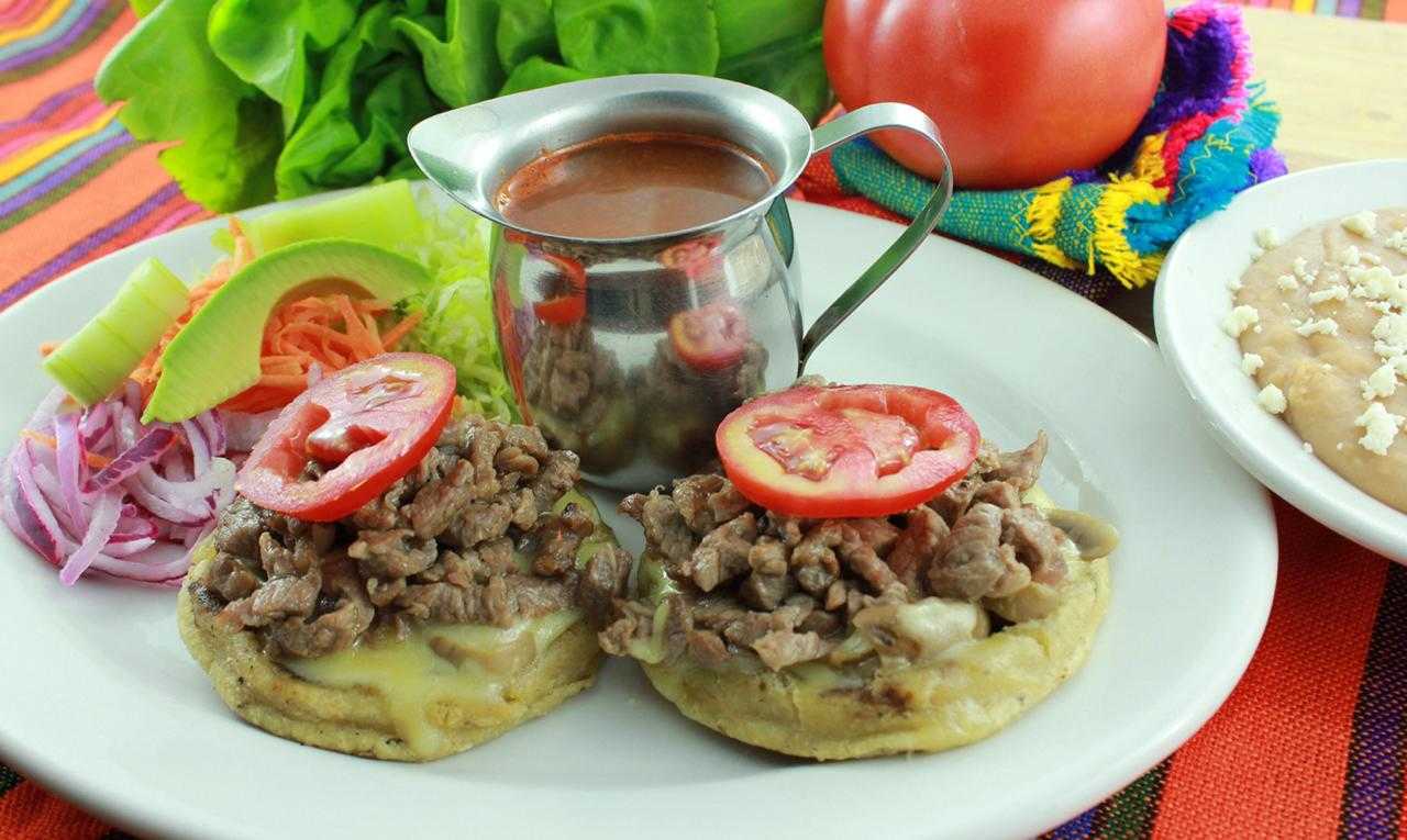 2 gorditas de nixtamal gratinadas con queso, champiñones y carne de res asada, ensalada de verduras frescas y frijoles refritos con quesito.