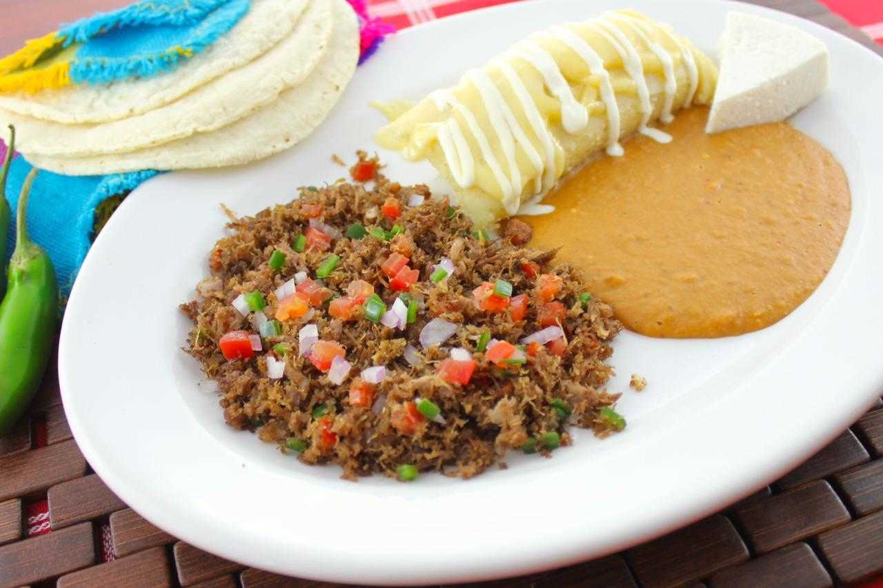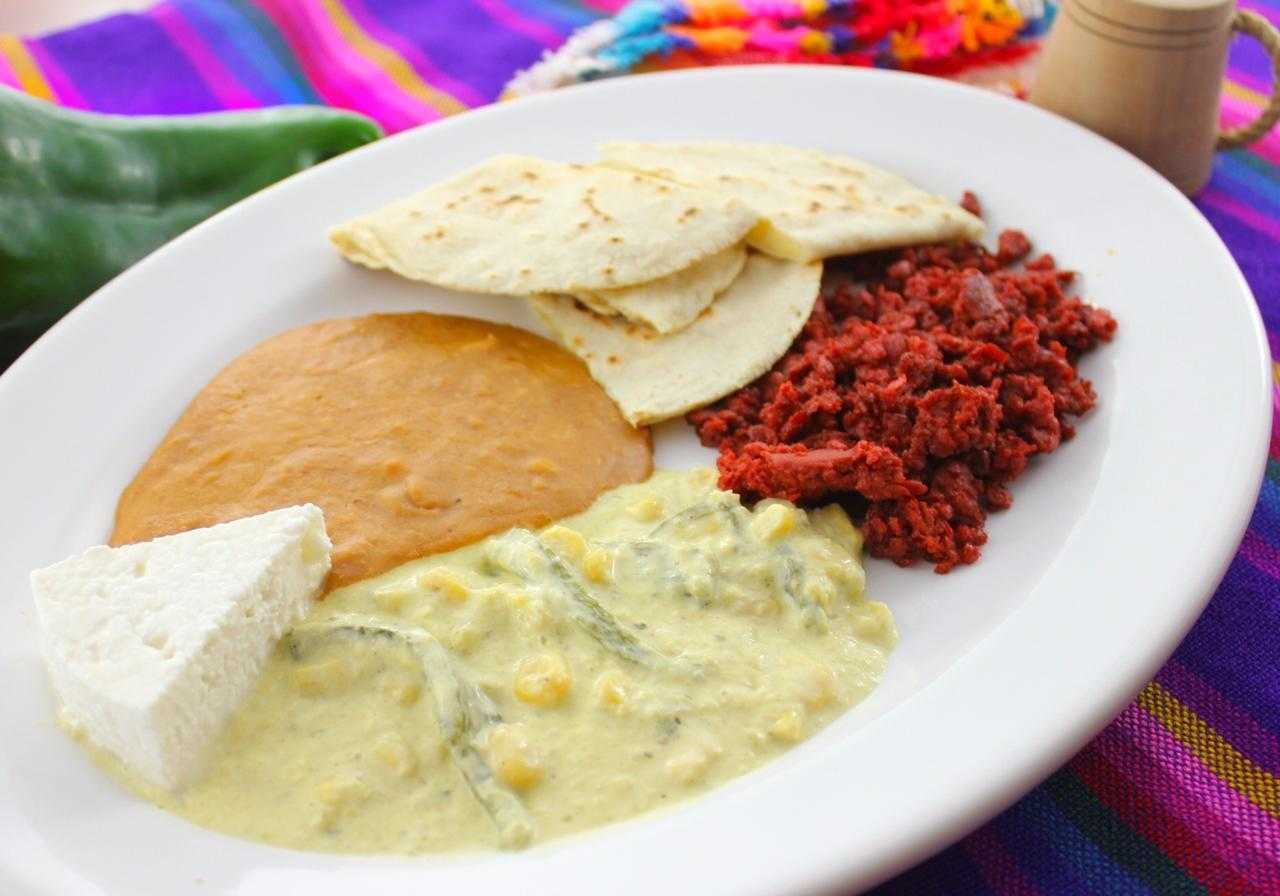 Combinación de Machaca asada a la mexicana, tamal de elote natural gratinado con crema, frijoles puercos, quesito fresco, tortillas de harina y maíz caseras.