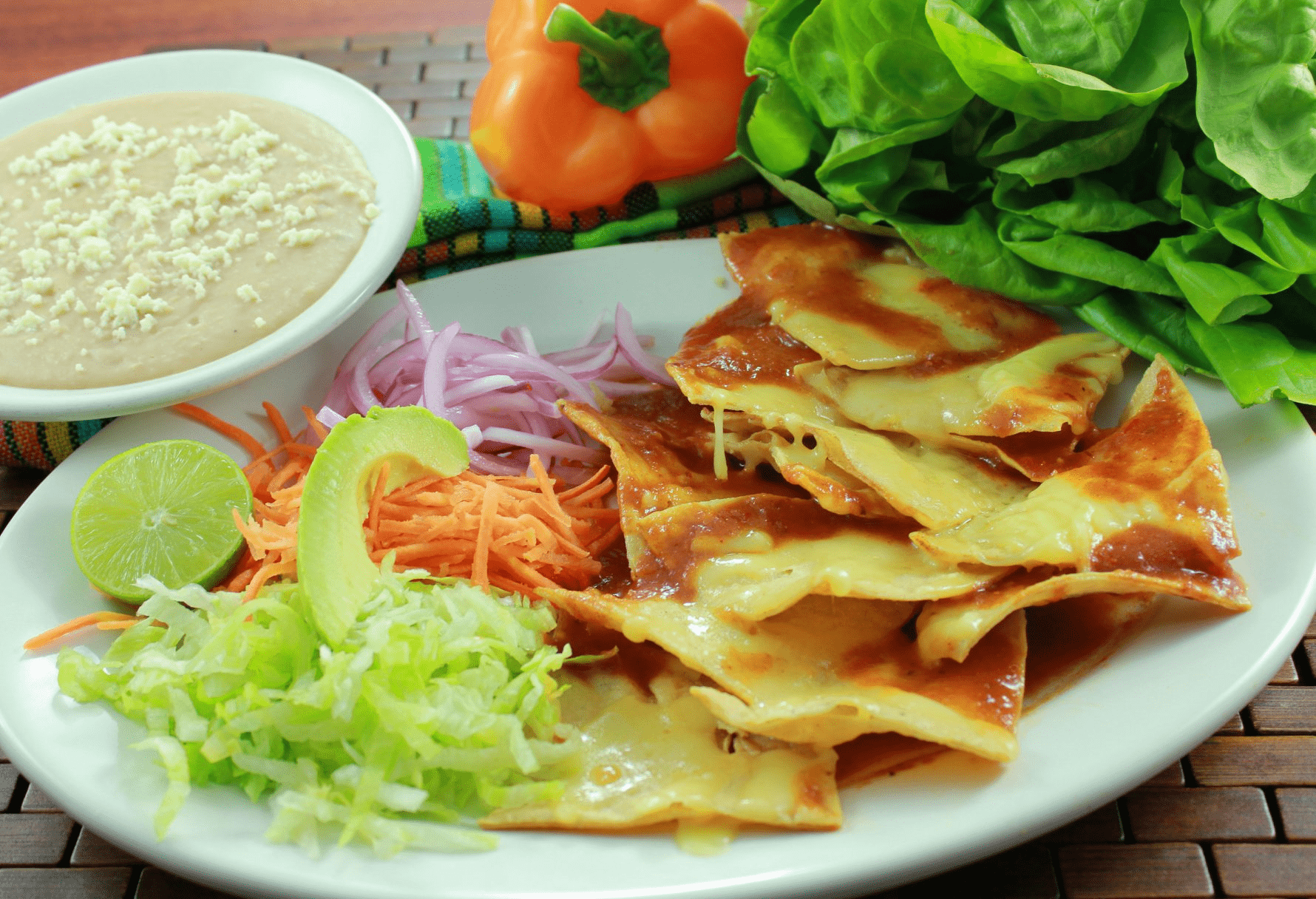 Chilaquiles bañados en salsa de Chile Colorado, gratinados, con pollo y crema; acompañados de ensalada de verduras fresca y frijoles refritos con quesito.