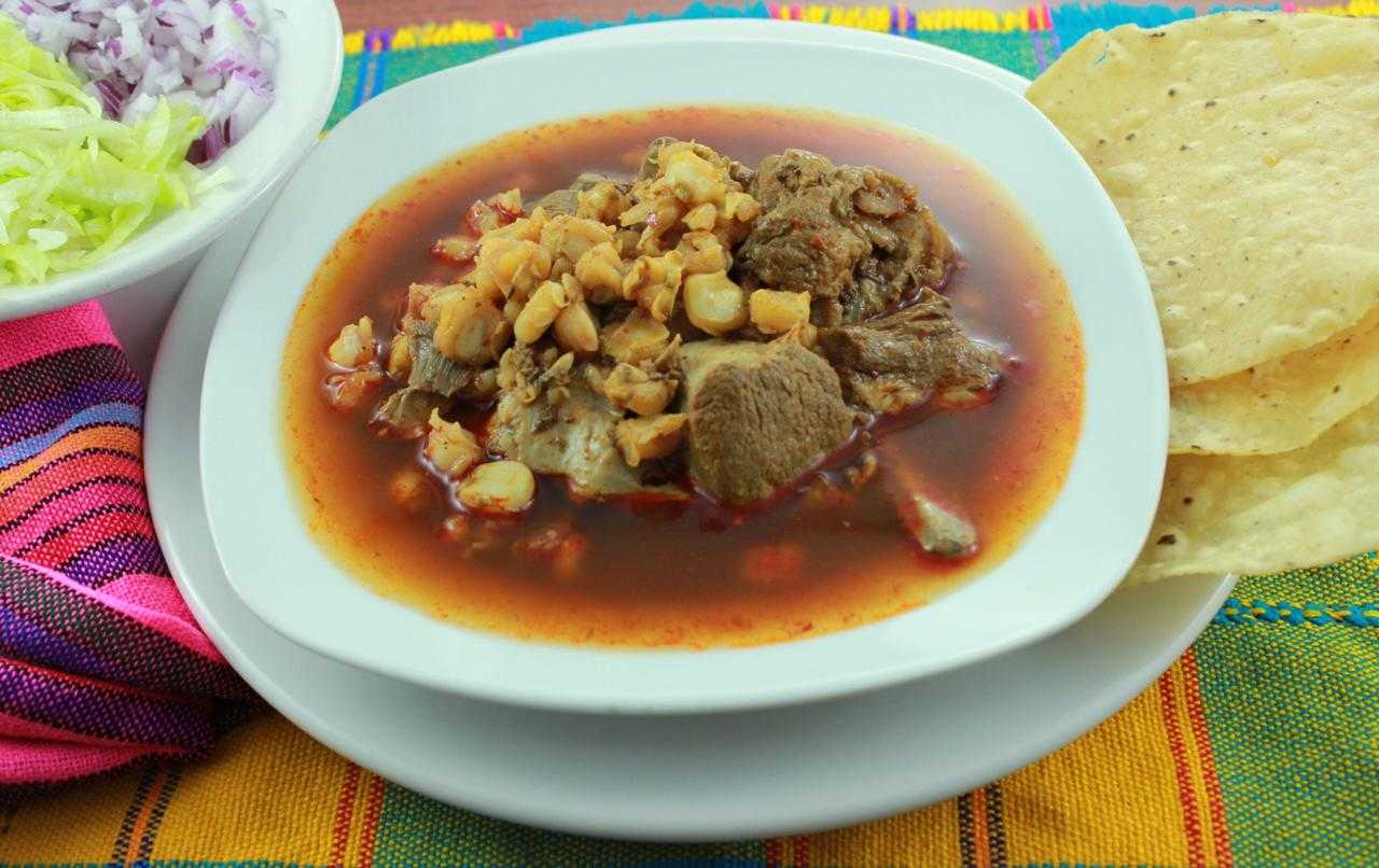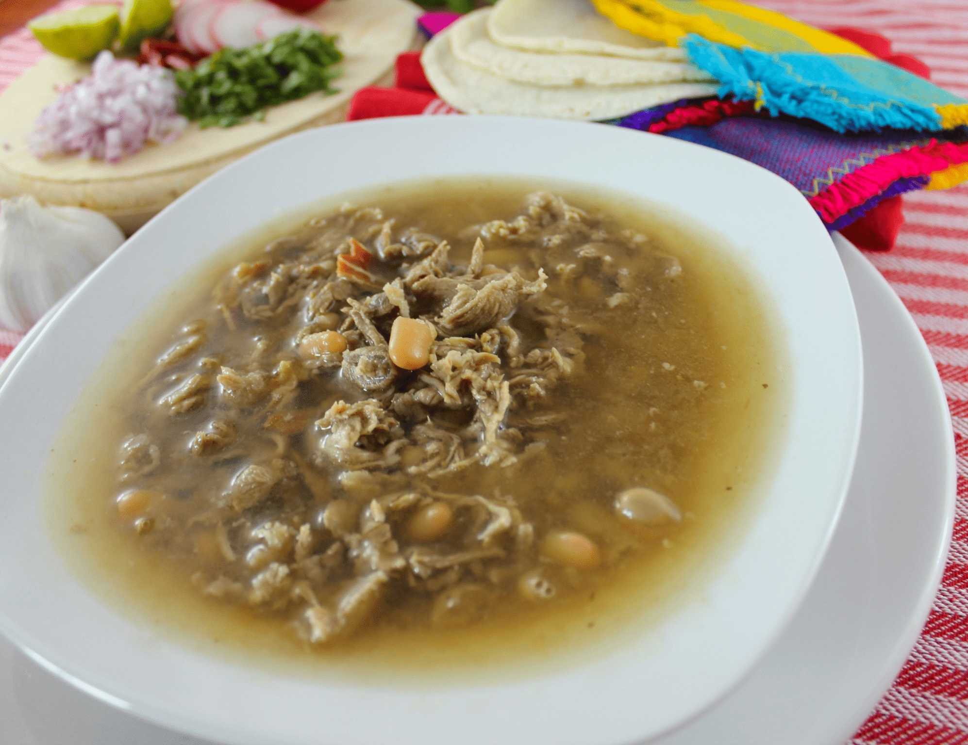 Pozole de carne de cerdo premium 1 lt, incluye lechuga, cebolla morada, tostadas y condimentos.