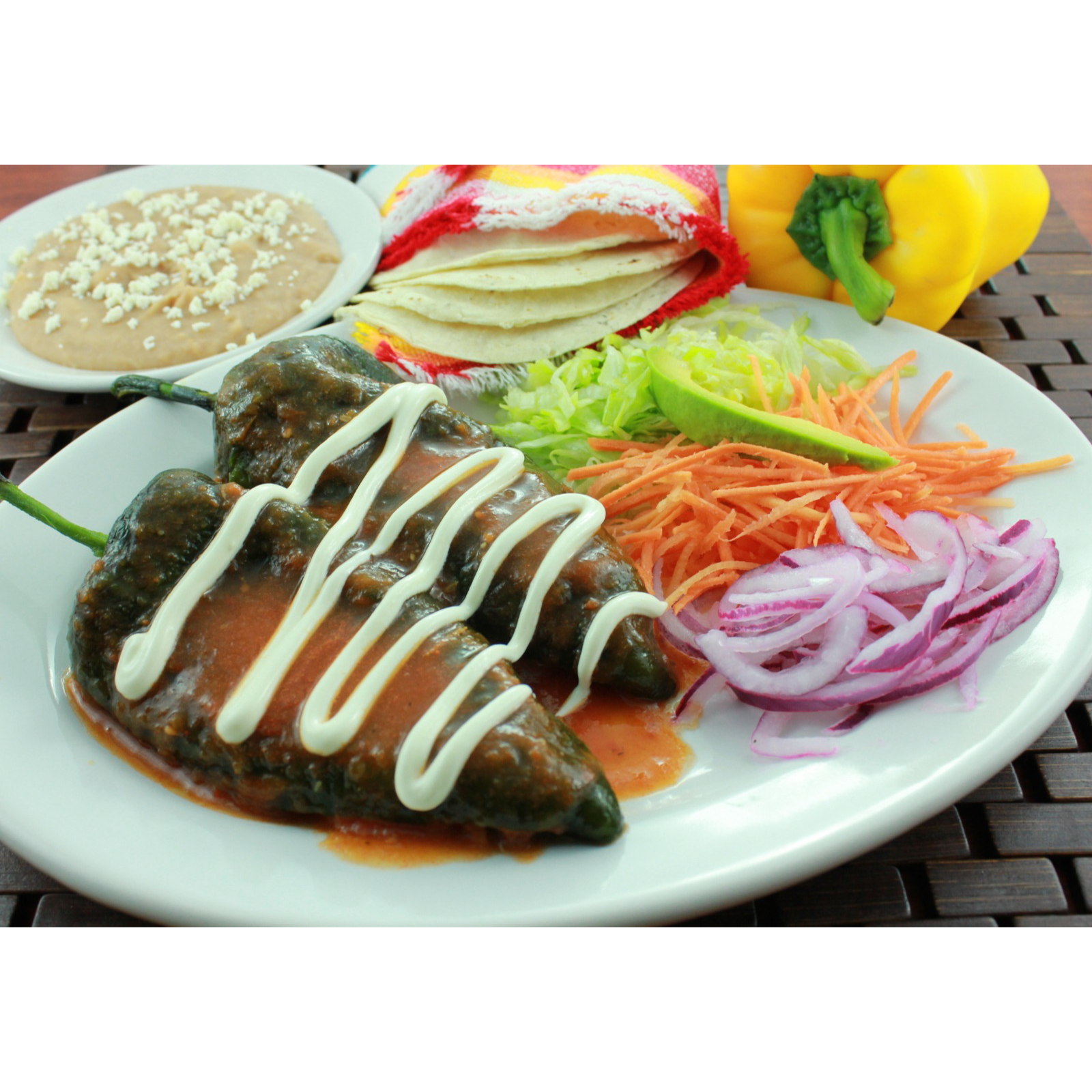 Combinación de Chile poblano relleno con tamal de elote, chilaquiles verdes, frijoles puercos y quesito fresco.