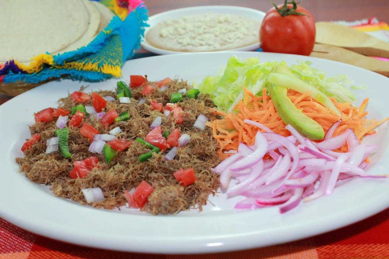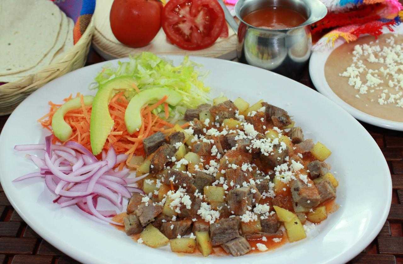 Machaca a la mexicana con ensalada de verduras fresca, frijoles refritos con quesito, tortillas de maíz y harina caseras.