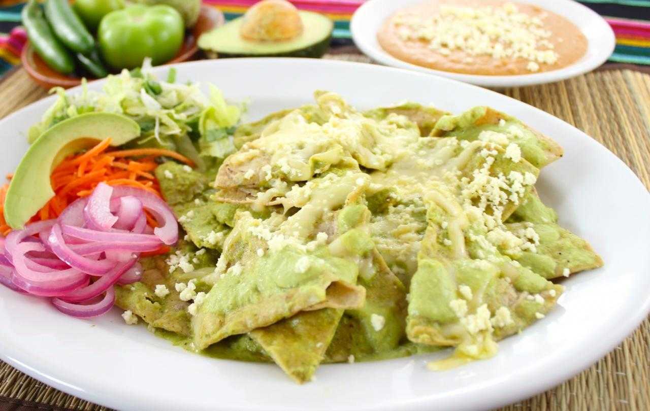 Chilaquiles bañados en salsa Suiza, gratinados, con pollo y crema; acompañados de ensalada de verduras fresca y frijoles refritos con quesito.