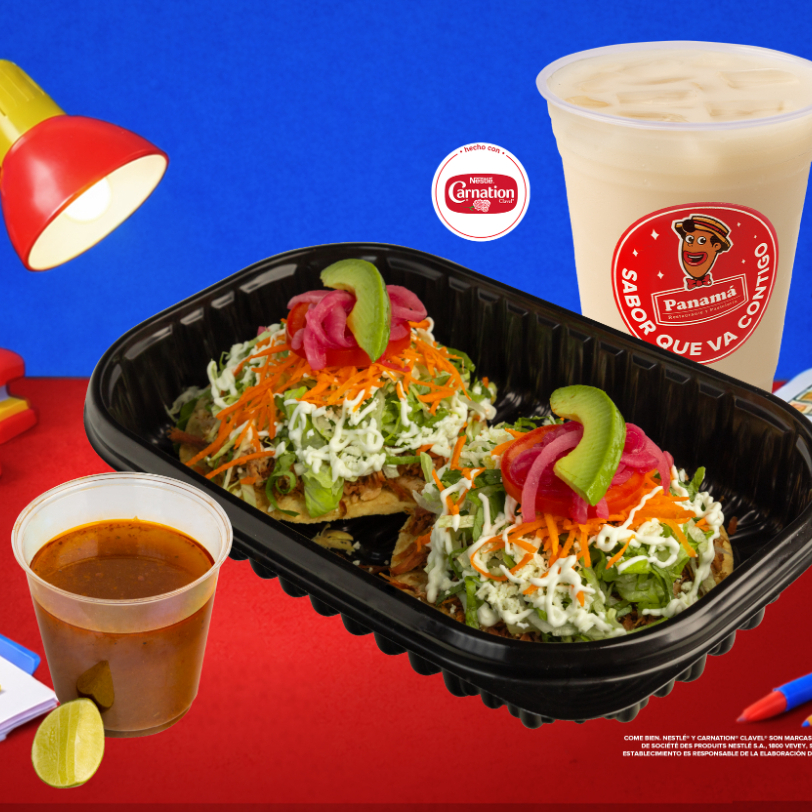 Incluye: Canicas de carnita rellenas de queso, agua fresca a elegir (limón o jamaica, 500 ml), Panitas Box y juguete sorpresa.