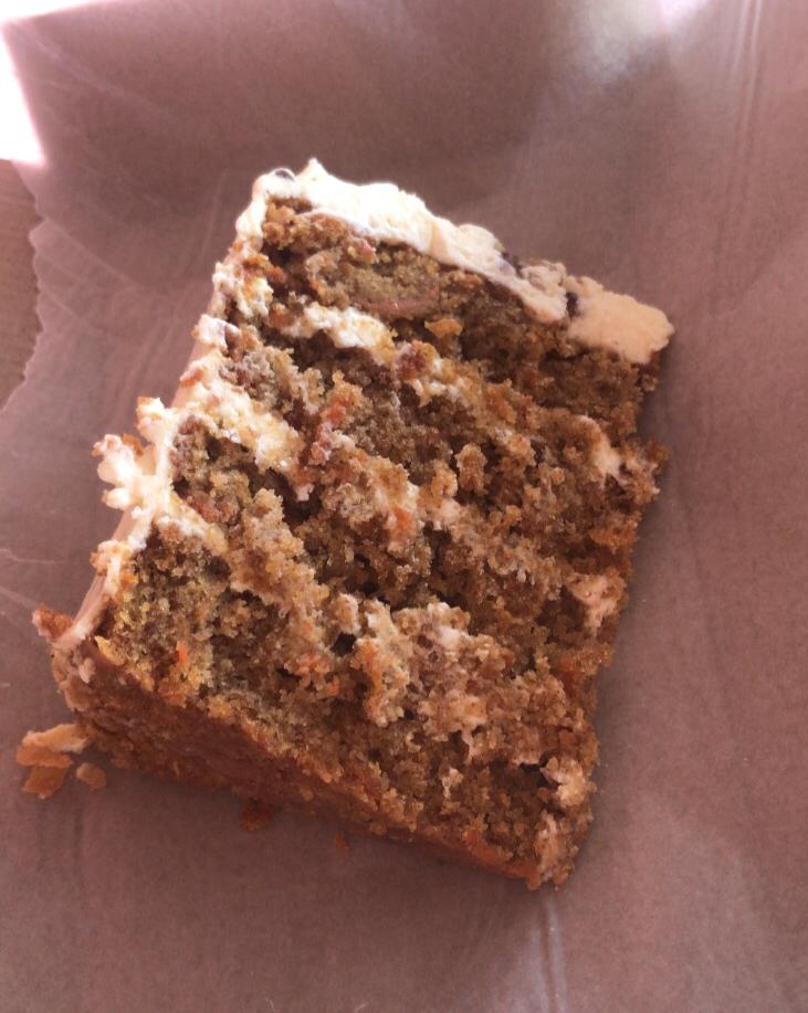 Rebanada de pastel de zanahoria rallada con nuez y betún de queso crema.
