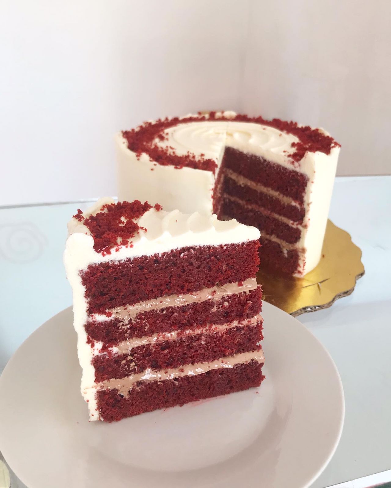 Delicioso pastel red velvet relleno de mousse de Nutella y cubierto de betún de queso crema.