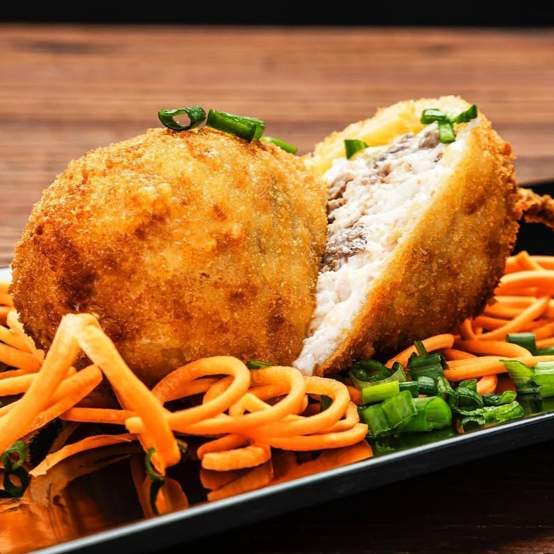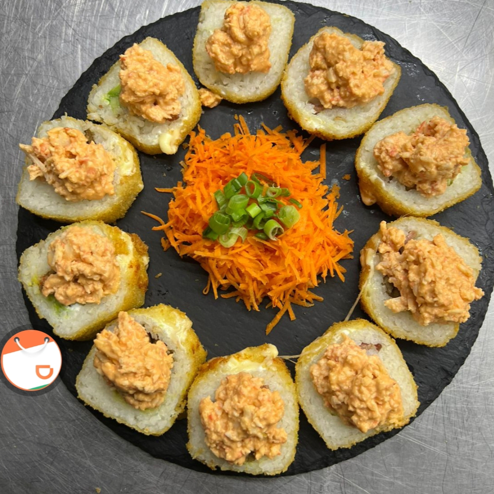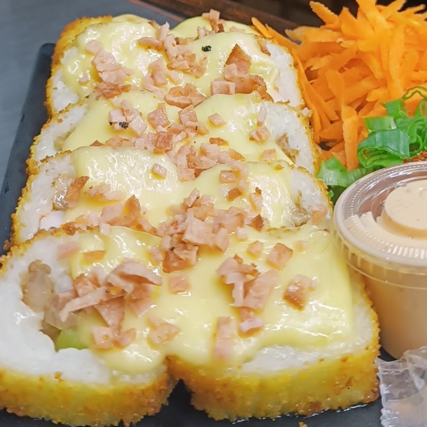 Philadelphia, aguacate, pepino, camaron, res, pollo, por fuera gratinado con tocino