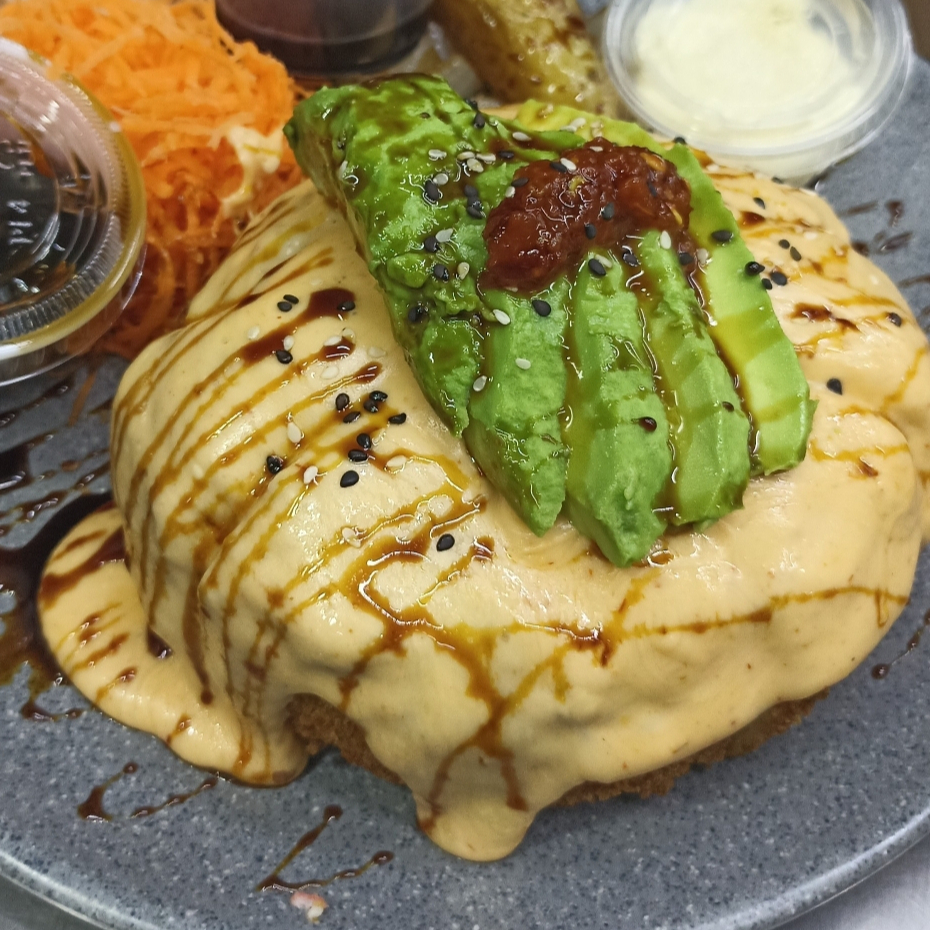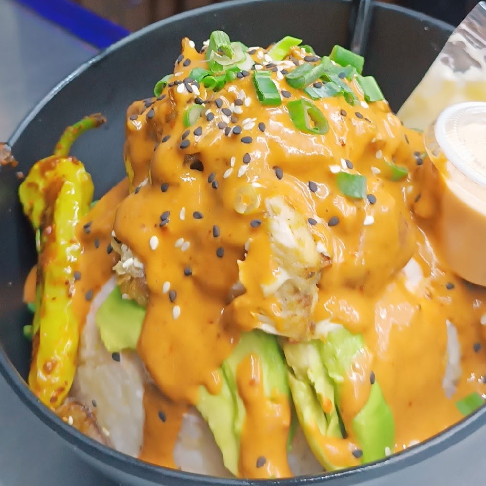 Philadelphia, aguacate, pepino, proteína a elegir topping kanikama, zanahoria, cebollin, aderezo de la casa y ajonjolí (Natural)(res,pollo o camarón a elegir)