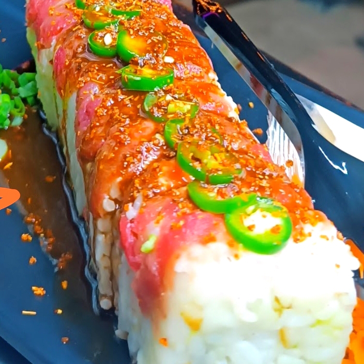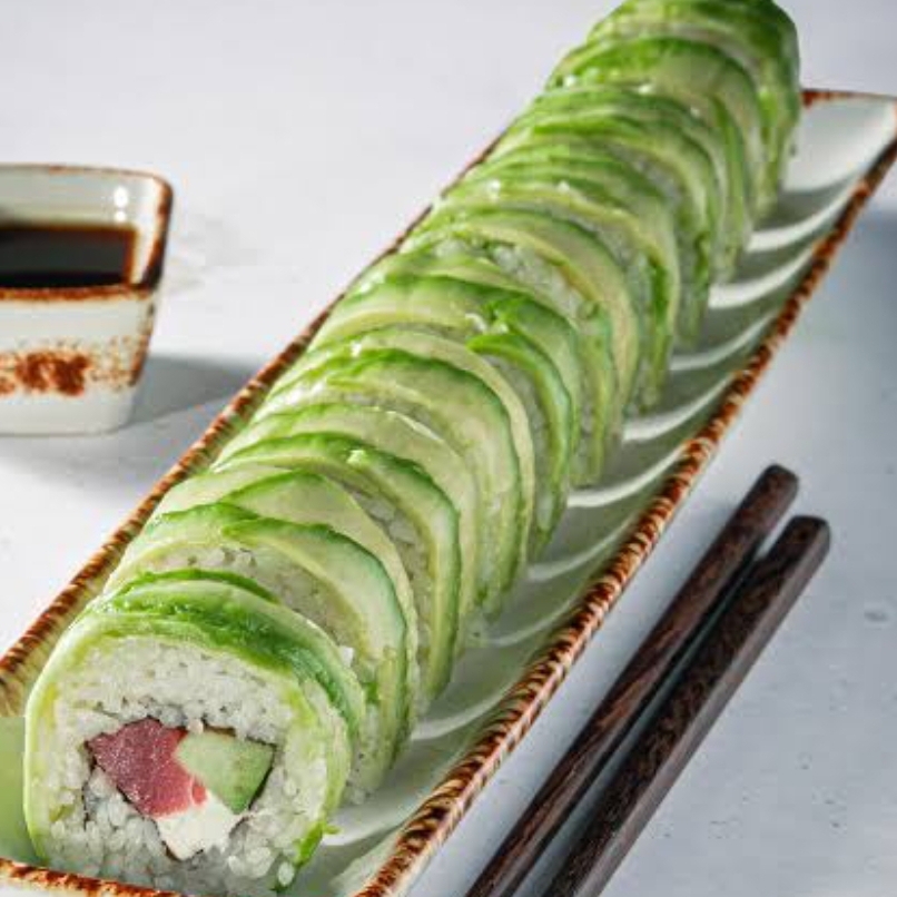 Philadelphia, aguacate, pepino, camarón por fuera forrado de atún rodajas de serrano y soya aguachile
