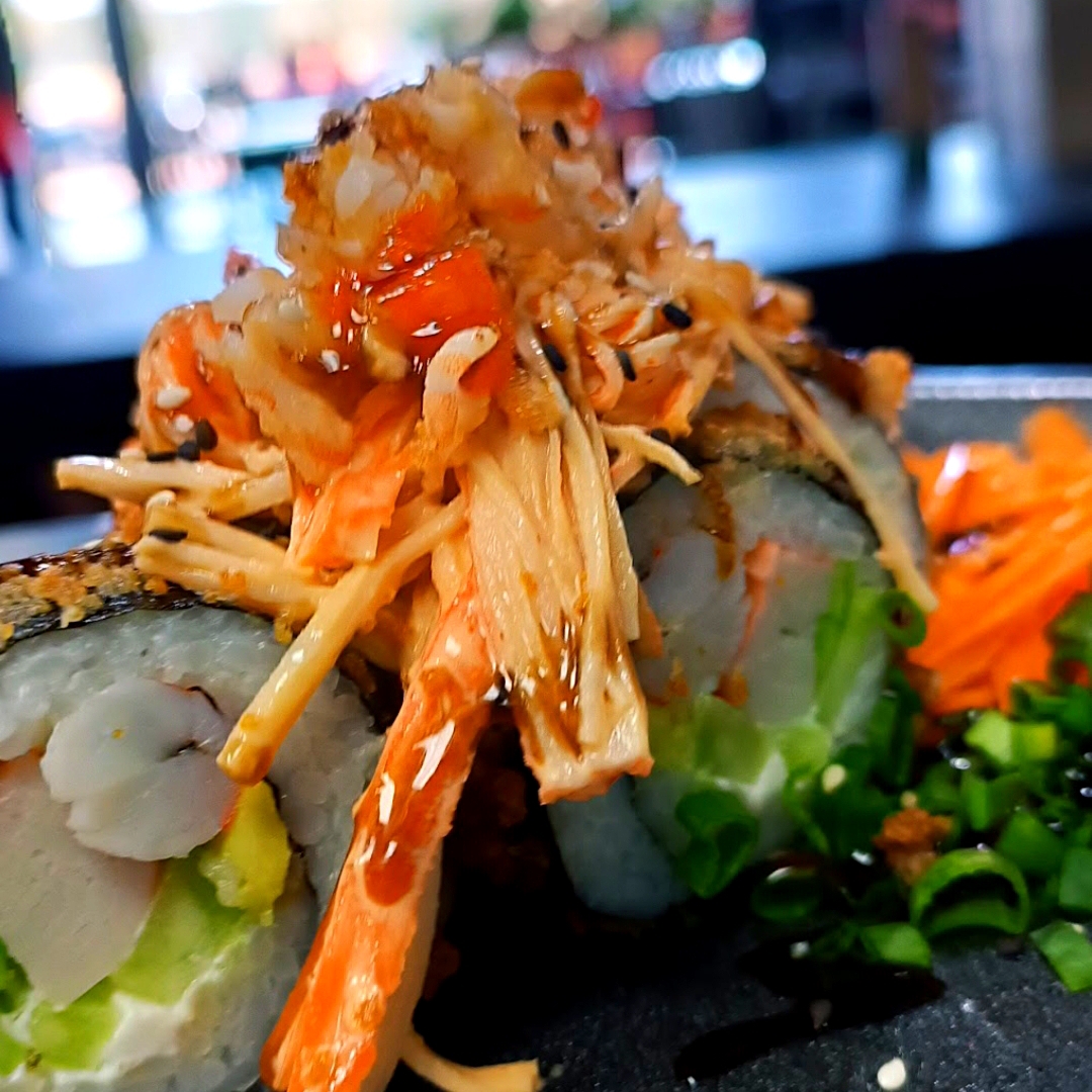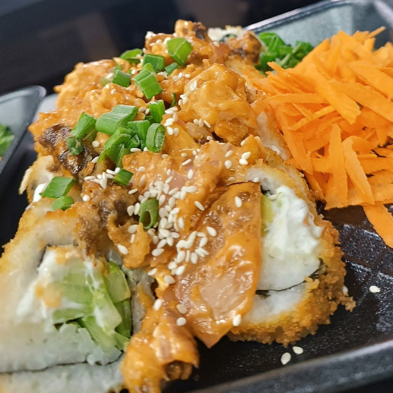 Philadelphia, aguacate, pepino, por fuera pollo, res, cebolla, crispy bañado con aderezo