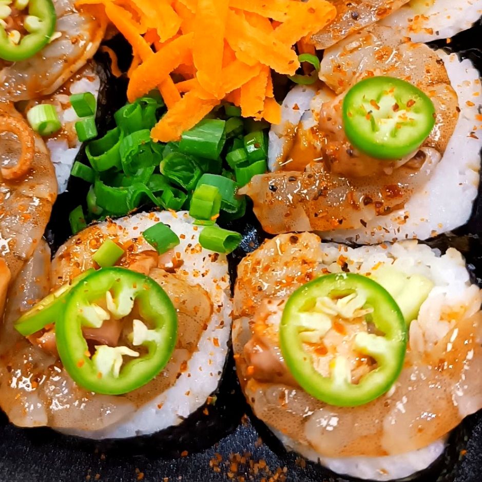 Philadelphia, aguacate, pepino,camaron por fuera camarón cocido, camarón crudo, pepino, cebolla,serrano bañado en soya aguachile