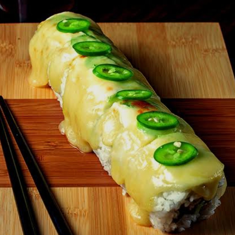 Philadelphia, aguacate, pepino, pollo, por fuera gratinado con serrano