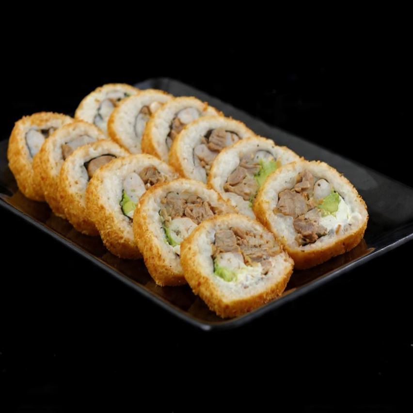 Philadelphia, aguacate, pepino,res por fuera topping horneado res, pollo, tocino y anguila (empanizado)