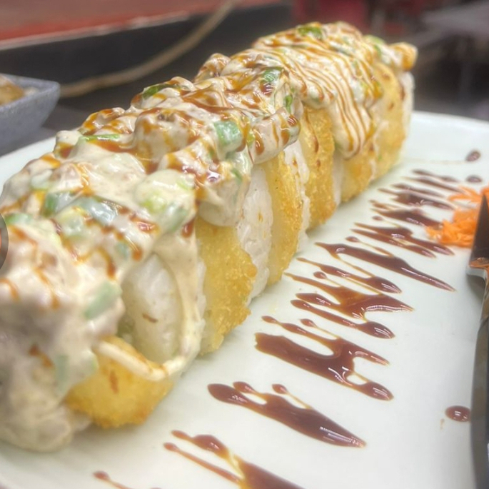 Philadelphia, aguacate, pepino, res, camaron, tocino, por fuera 3 quesos topping Tampico preparado con tocino picosito