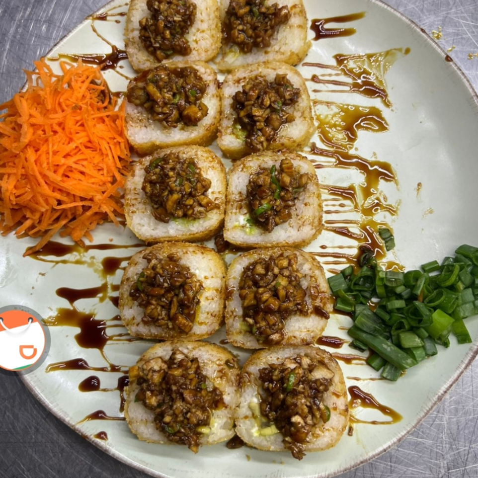 Arroz, Philadelphia, tampico, aguacate al rededor res, pollo, camaron frito rallado de anguila
