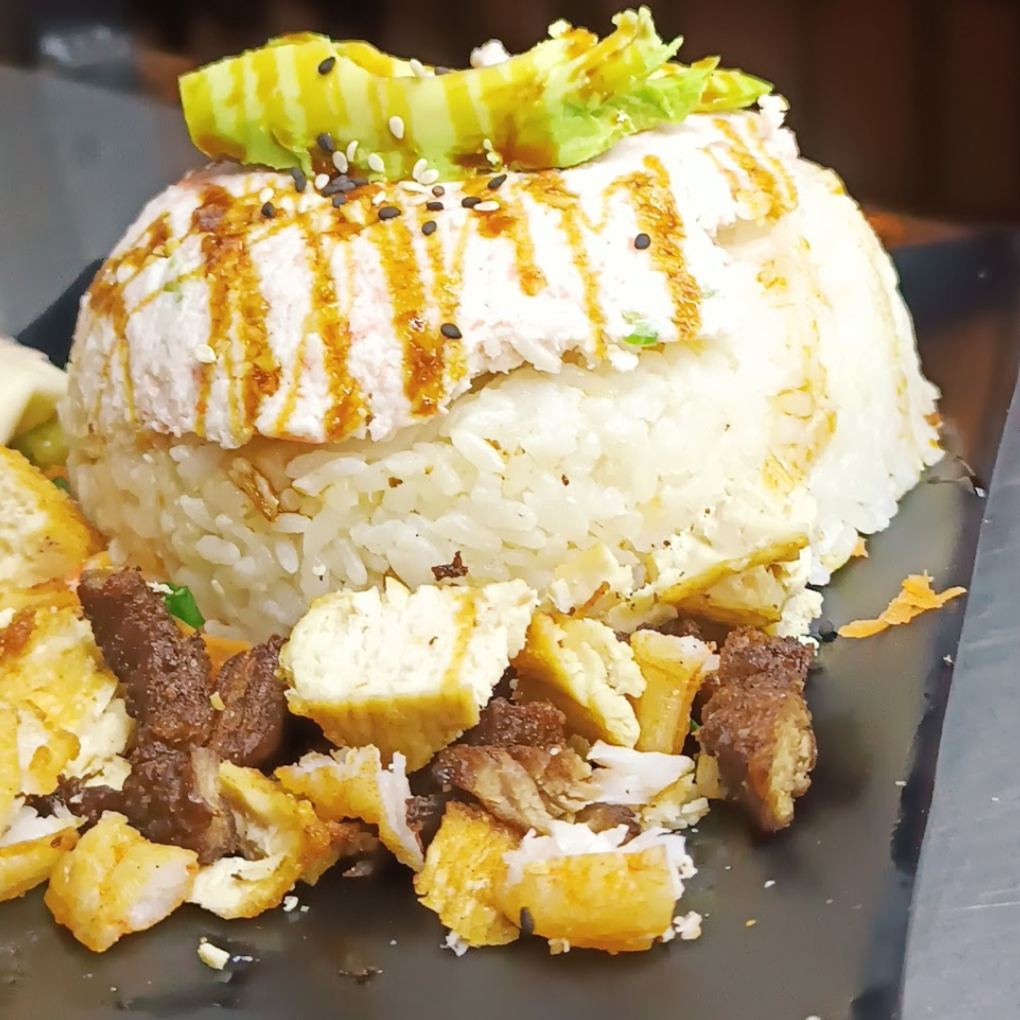 Arroz, Philadelphia, tampico, res, pollo, cebolla crispy bañando en aderezo