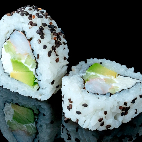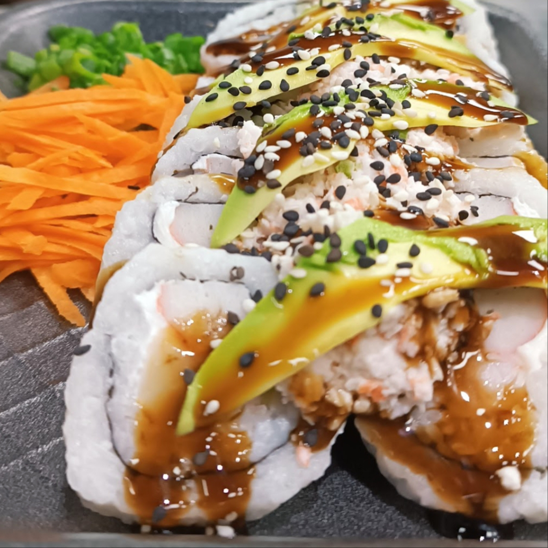 Philadelphia, aguacate, pepino, camarón, surimi, coronado con tampico y aguacate rallado de anguila y ajonjolí