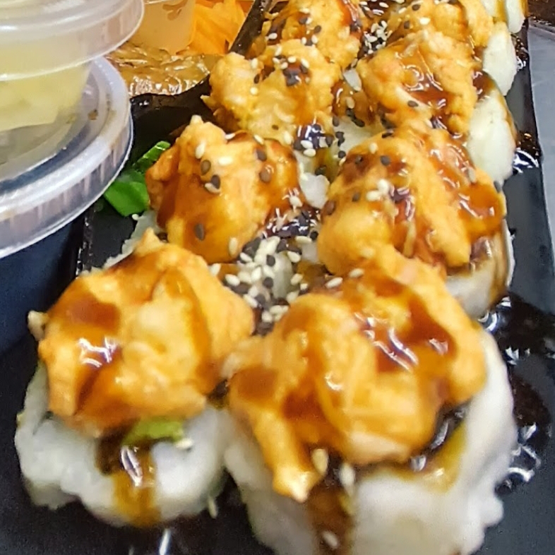 Philadelphia, aguacate, pepino, camarón por fuera topping de kanikama spicy con camarones empanizados rallado de anguila y puntos de sirracha