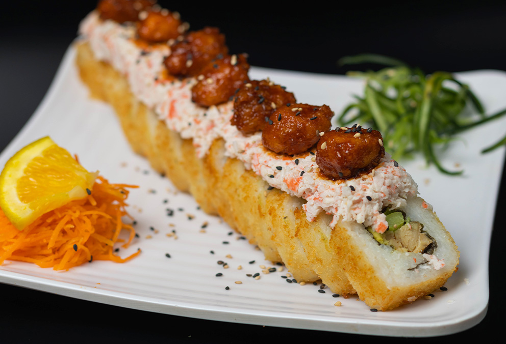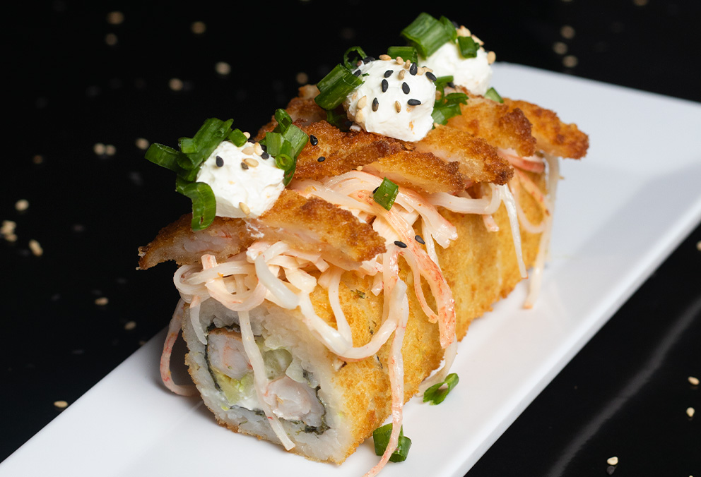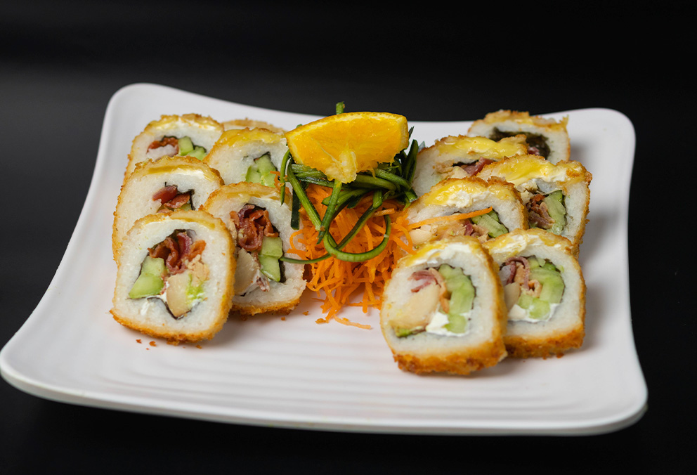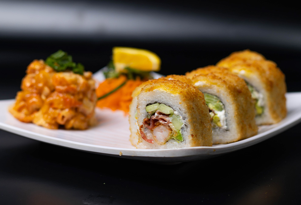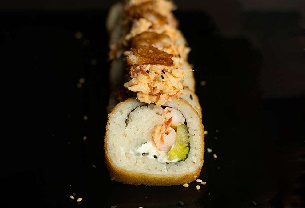 Rollo Empanizado con base de aguacate, phila, pepino, camarón y tres quesos por fuera.