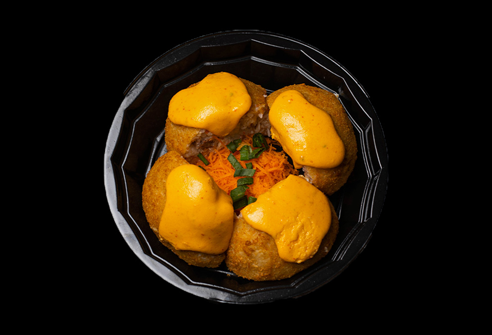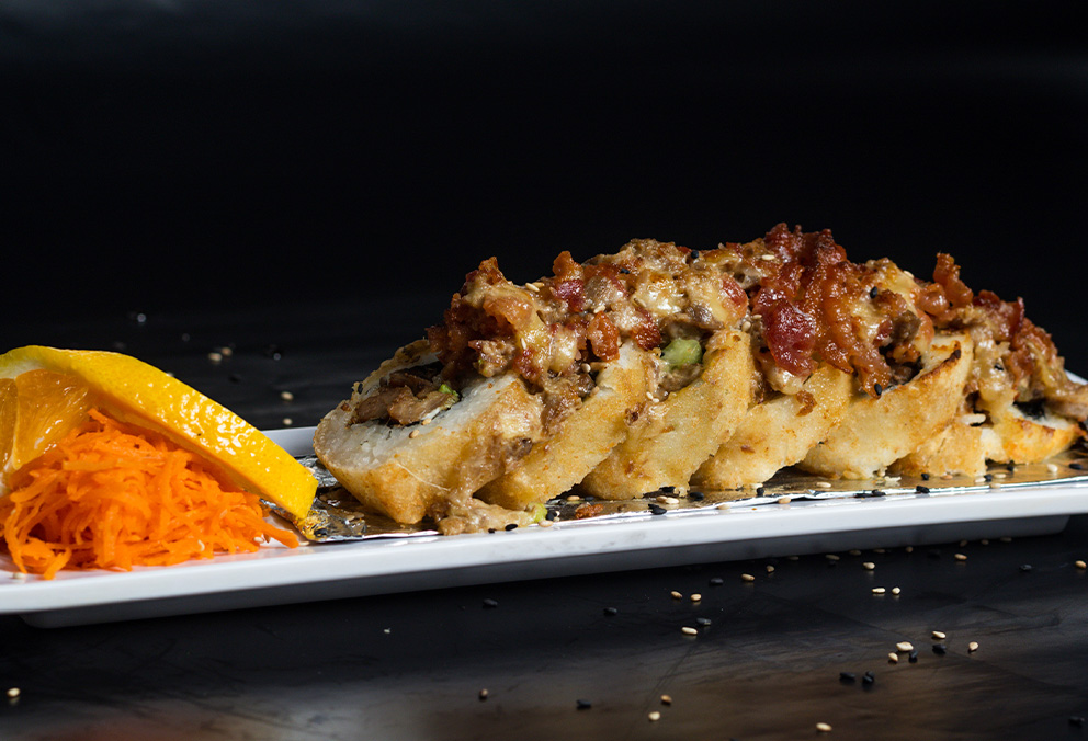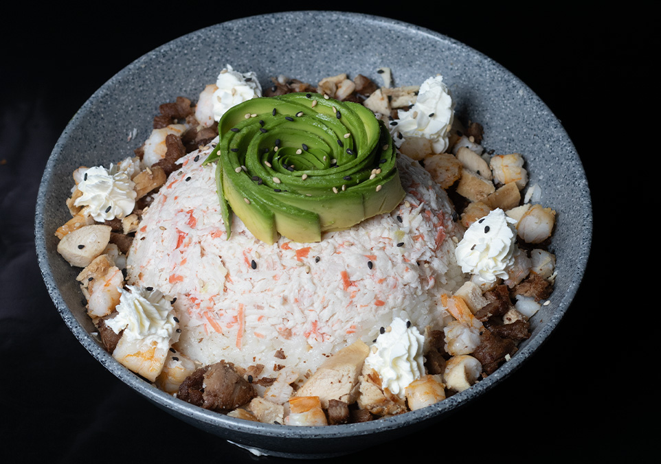 Bola de arroz con res, camarón, pollo, Tampico, philadelphia y gratinado con queso spicy.